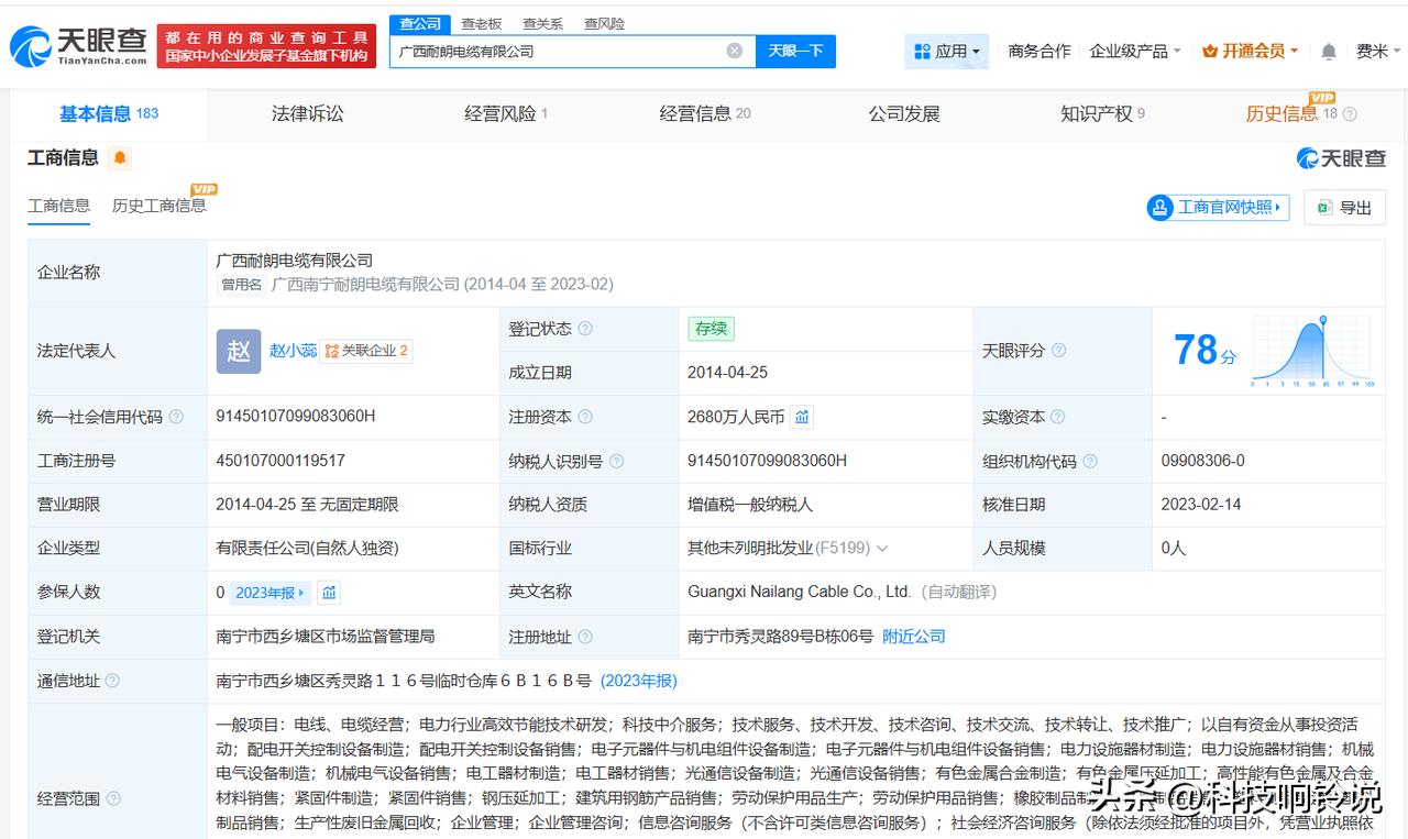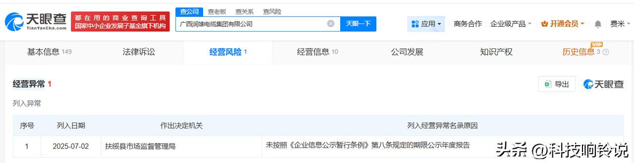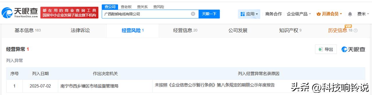 【去年315曝光瘦身线缆涉事企业现状 去年315曝光瘦身线缆企业已经营异常】 去年3月15日,央视3·15晚会曝光瘦身线缆的问题,广西耐朗电缆有限公司、广西润雄电缆集团有限公司被点名。一年后,被曝光的企业现状如何? 天眼查工商信息显示,广西耐朗电缆有限公司成立于2014年4月,法定代表人为赵小蕊,注册资本2680万人民币,经营范围包括电线、电缆经营,电力行业高效节能技术研发,科技中介服务等。股东信息显示,该公司由赵小蕊全资持股。经营风险信息显示,去年7月,该公司因未按照规定的期限公示年度报告,被南宁市西乡塘区市场监督管理局列入经营异常名录。 广西润雄电缆集团有限公司成立于2020年11月,法定代表人为温立锁,注册资本5180万人民币,经营范围包括货物进出口、道路货物运输、电力设施器材制造等,由田京芳、温立锁共同持股。经营风险信息显示,去年7月,该公司因未按照规定的期限公示年度报告,被扶绥县市场监督管理局列入经营异常名录。 天眼查信息:
