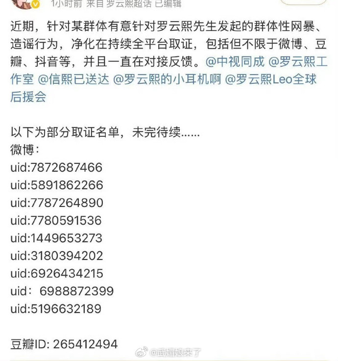 罗云熙方发布告黑维权取证名单,表示近期有群体有意针对罗云熙发起网暴、造谣等行为!网络并非法外之地,支持罗云熙依法维权!