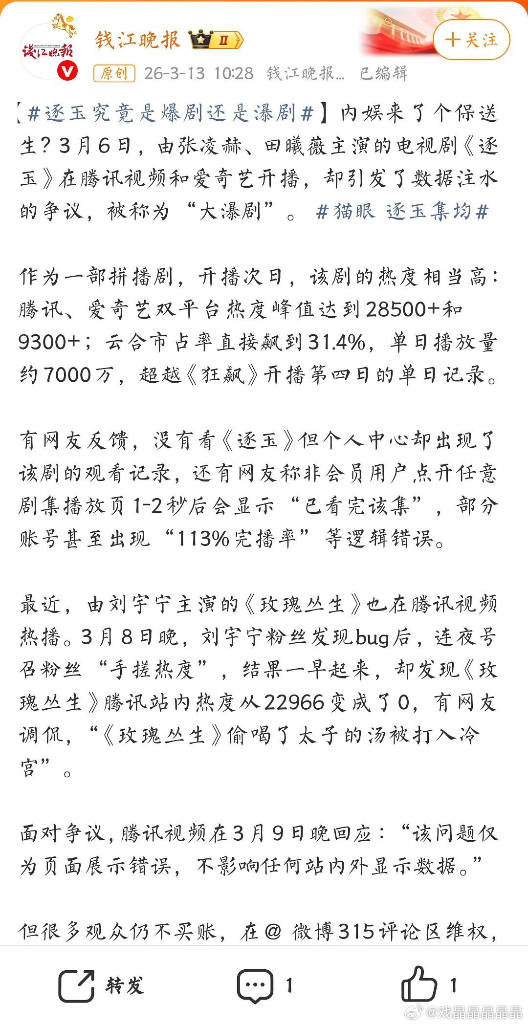 黑龙江日报和钱江晚报都报道了逐玉的数据被大家质疑。