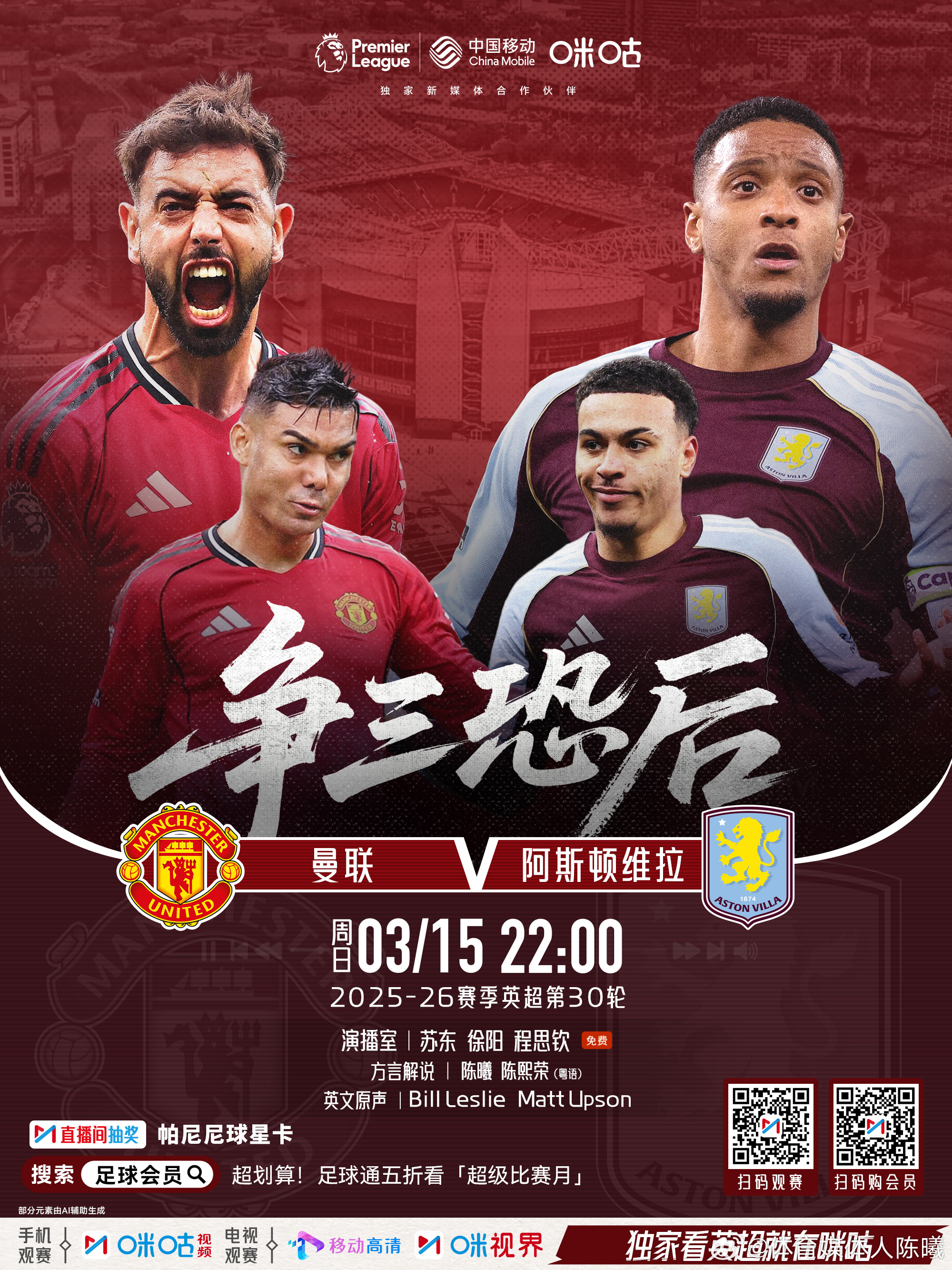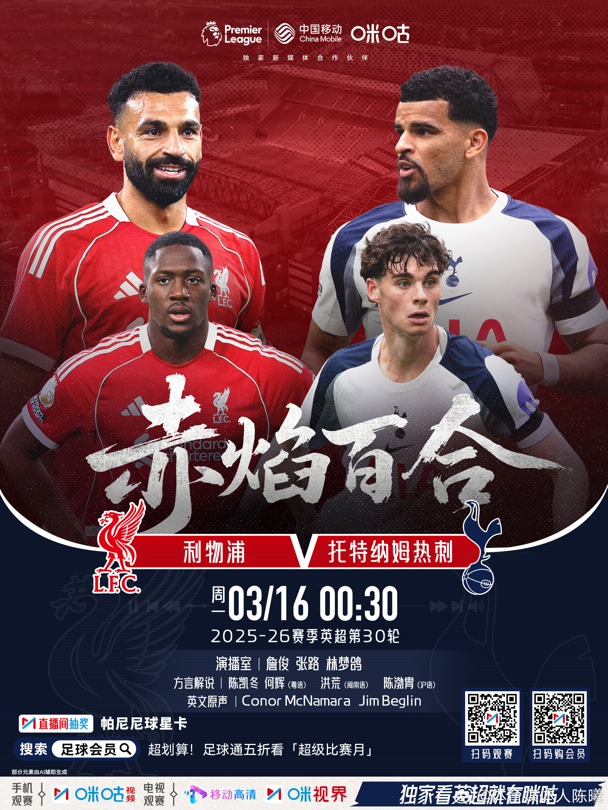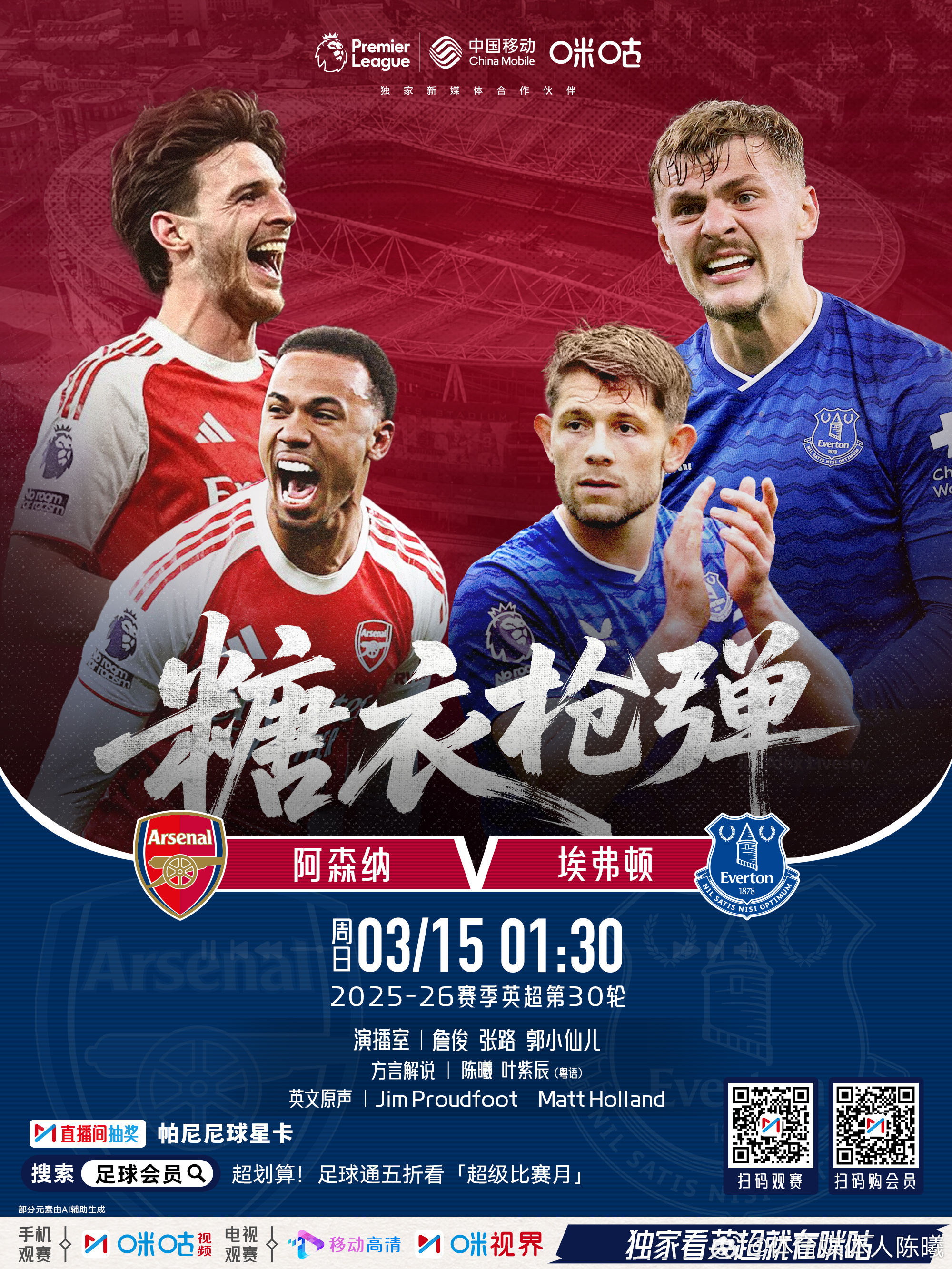 本周咪咕视频英超粤语直播这样安排3月15日 1:30切尔西VS纽卡斯尔 解说:陈凯冬 何辉1:30 阿森纳VS埃弗顿 解说:陈曦 叶紫辰3月15日 22:00 曼联VS阿斯顿维拉 解说:陈曦 陈熙荣3月16日 0:30 利物浦VS热刺 解说:陈凯冬 何辉英超曼联阿森纳热刺利物浦英超