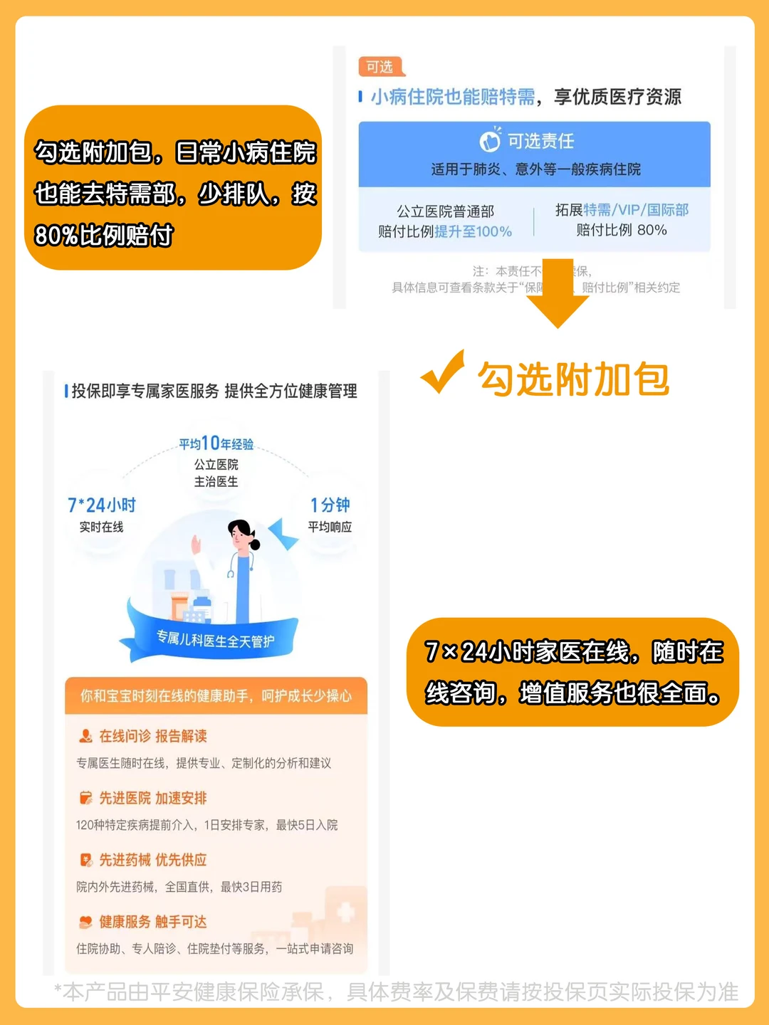 像白血病等120种重疾,可享三甲🏥特需部/国际部100%比例赔付,让宝宝得到更专业的诊疗,少遭罪!还能勾选附加包,这样普通🦠也能申请特需部治疗,按80%比例赔付。