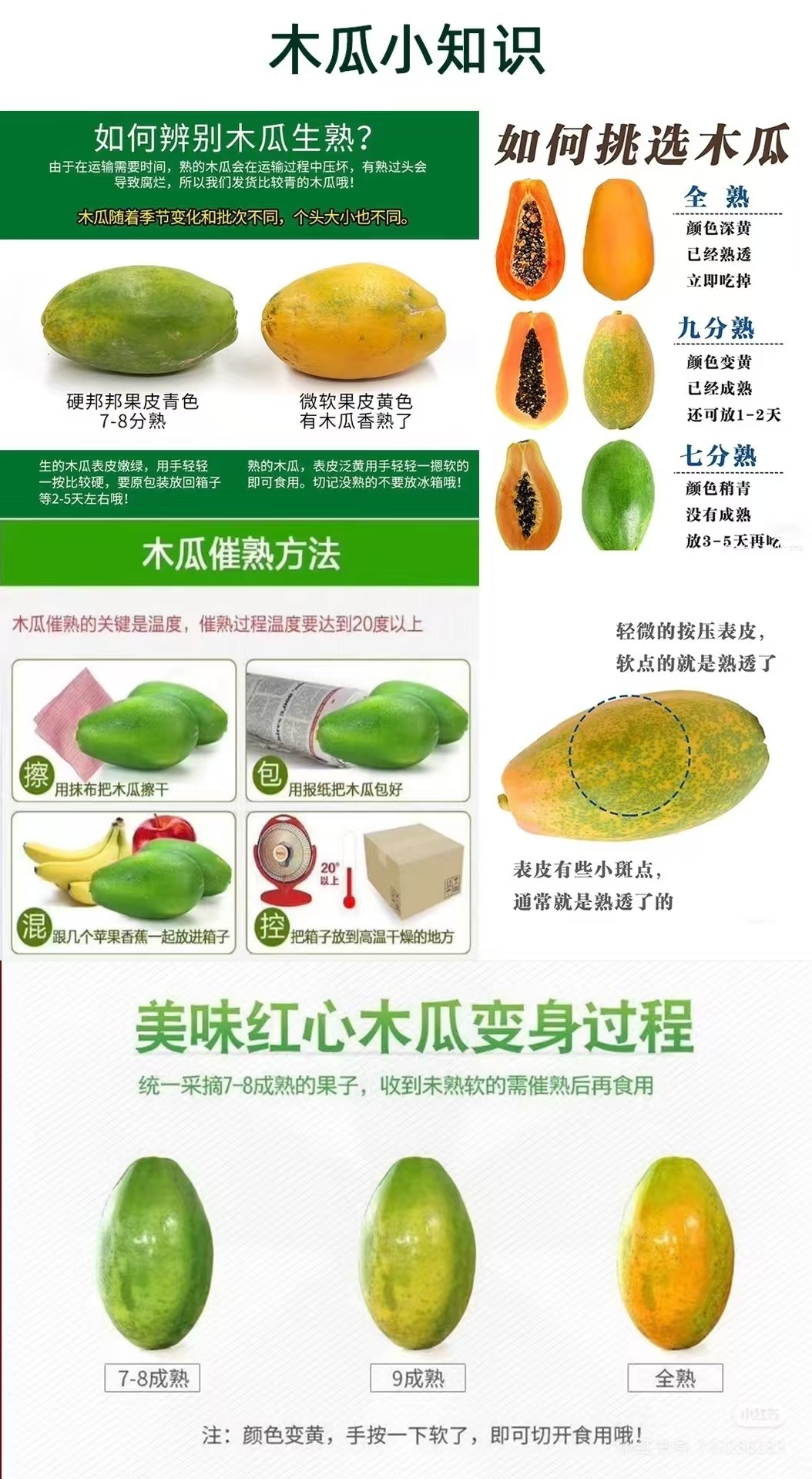由于要考虑路上运输的时间,我们不会在木瓜全熟的时候才发走。发的时候是半熟的。大家收到看到是绿色的,一定不要直接开吃,放放再吃