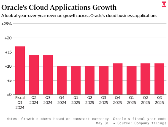 甲骨文首次披露,上季度其多个云应用品类的收入增速环比至少下降数个百分点,包括企业资源规划、客户管理和供应链管理。