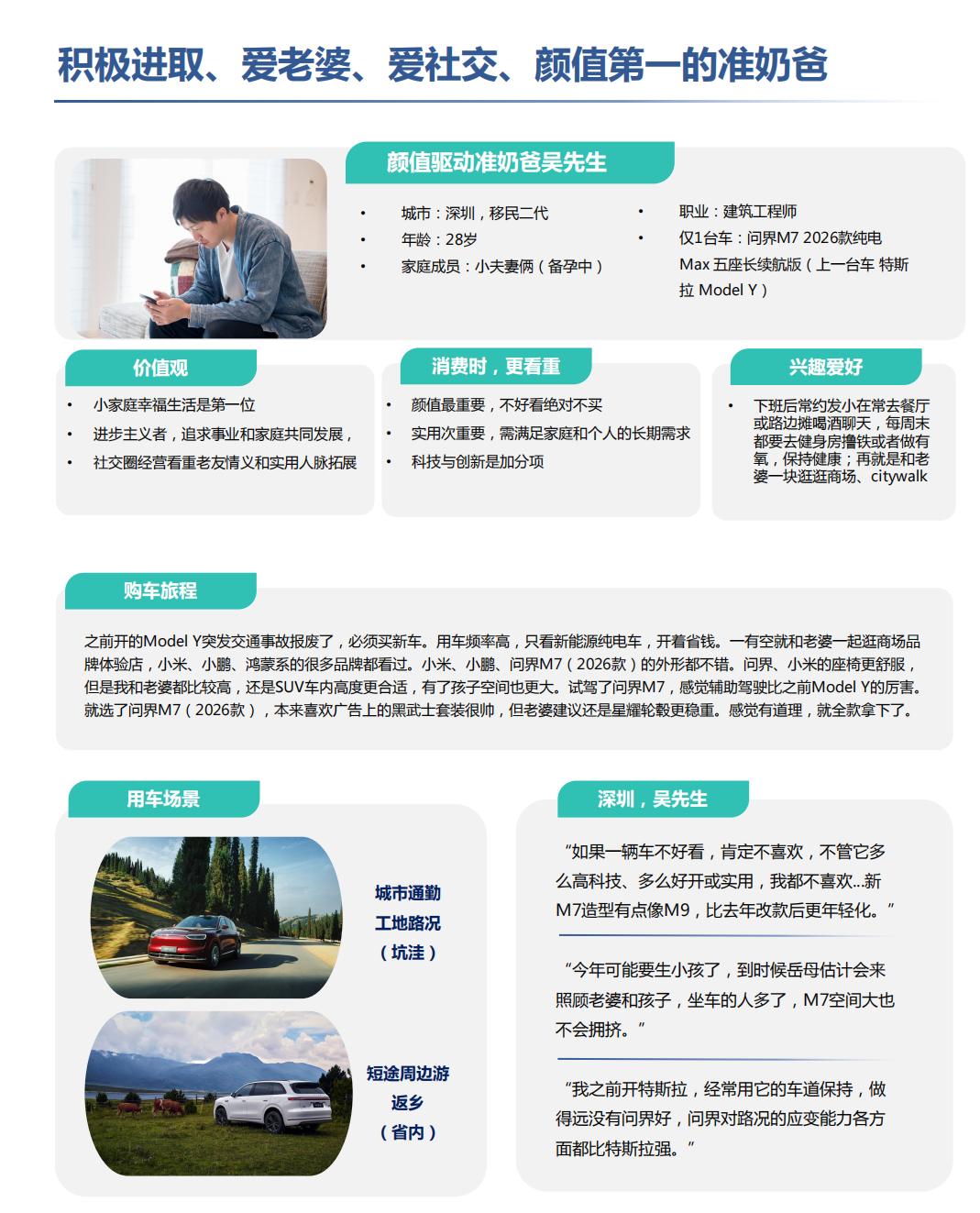 全新问界M7的车主画像,本身就是一份硬核产品力调研报告 最近一份关于全新问界M7的调研报告在圈内传开了,数据挺有意思,它不只是给车主定性,更像是给这车的产品力做了一次“反向验证”。 报告显示,车主普遍年轻、高知,且把安全和辅助驾驶放在购车决策的前位。这恰好击中了当前新能源品质家庭的核心诉求。你会发现,车主们最在意的点,正是全新问界M7下功夫最深的地方。比如对安全的极致追求,对辅助驾驶全场景覆盖能力的打磨,精准对应了这群高要求用户的真实痛点。85%的NPS推荐值也印证了这一点,它不是靠配置单打动人,而是靠实际的硬实力,让懂行、挑剔的品质家庭给出了高分。这份调研报告,某种程度上就是用户用真金白银为产品力投出的信任票。