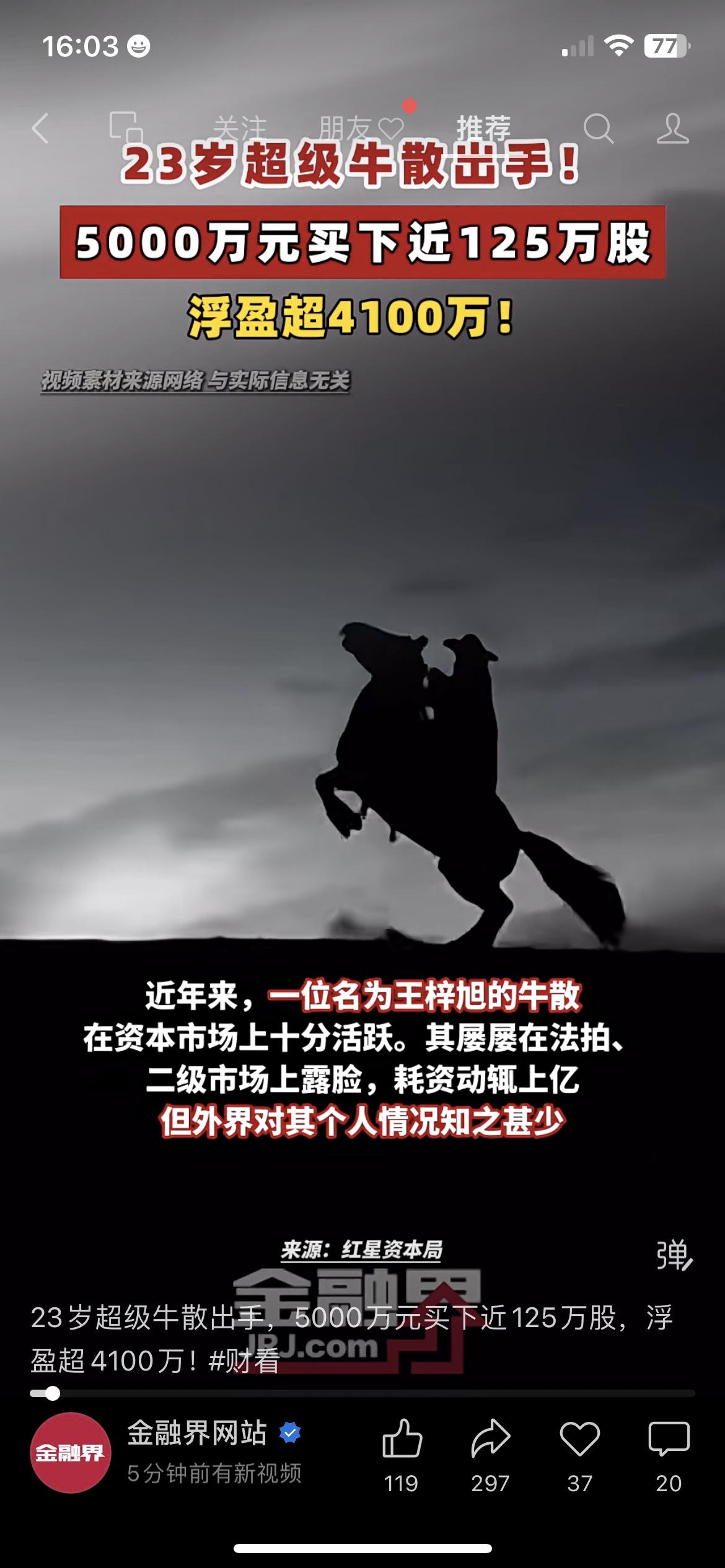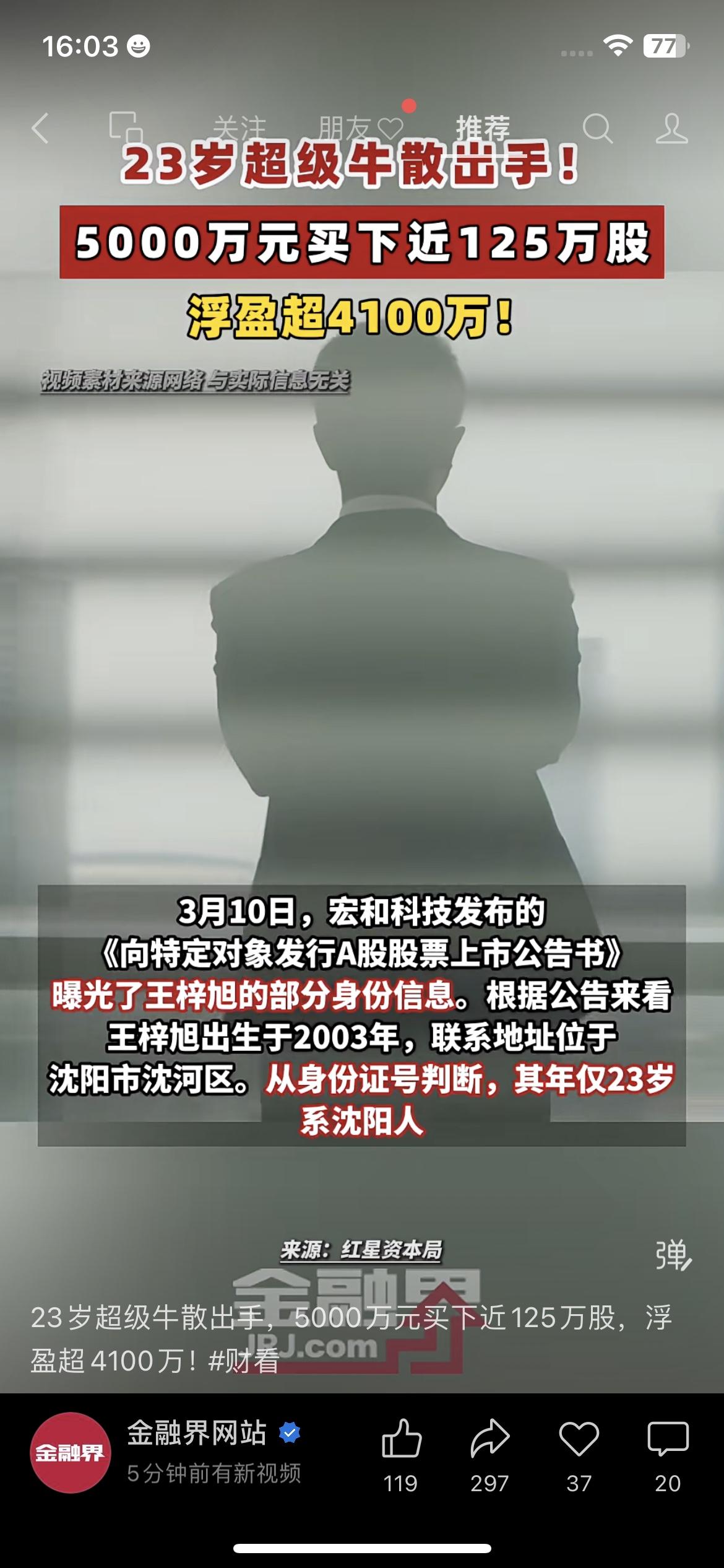 23岁投资者持股浮盈引关注,普通人切勿盲目模仿 23岁投资者王梓旭持股引发关注,投入资金后出现较大浮盈,持有多家公司股份,市值规模较高。不少网友表示羡慕,但需清醒认识:牛散成功属于小概率案例,普通投资者不可直接复制。 股市波动较大,浮盈并非实际盈利,随时可能缩水;其背后是专业研究与风险控制,并非单纯运气。 对普通人来说,股市投资稳字当头,不追求一夜暴富,坚持理性配置更重要。 市场有风险,投资需谨慎,本文不构成任何投资建议。 牛散 炒股 财商 投资