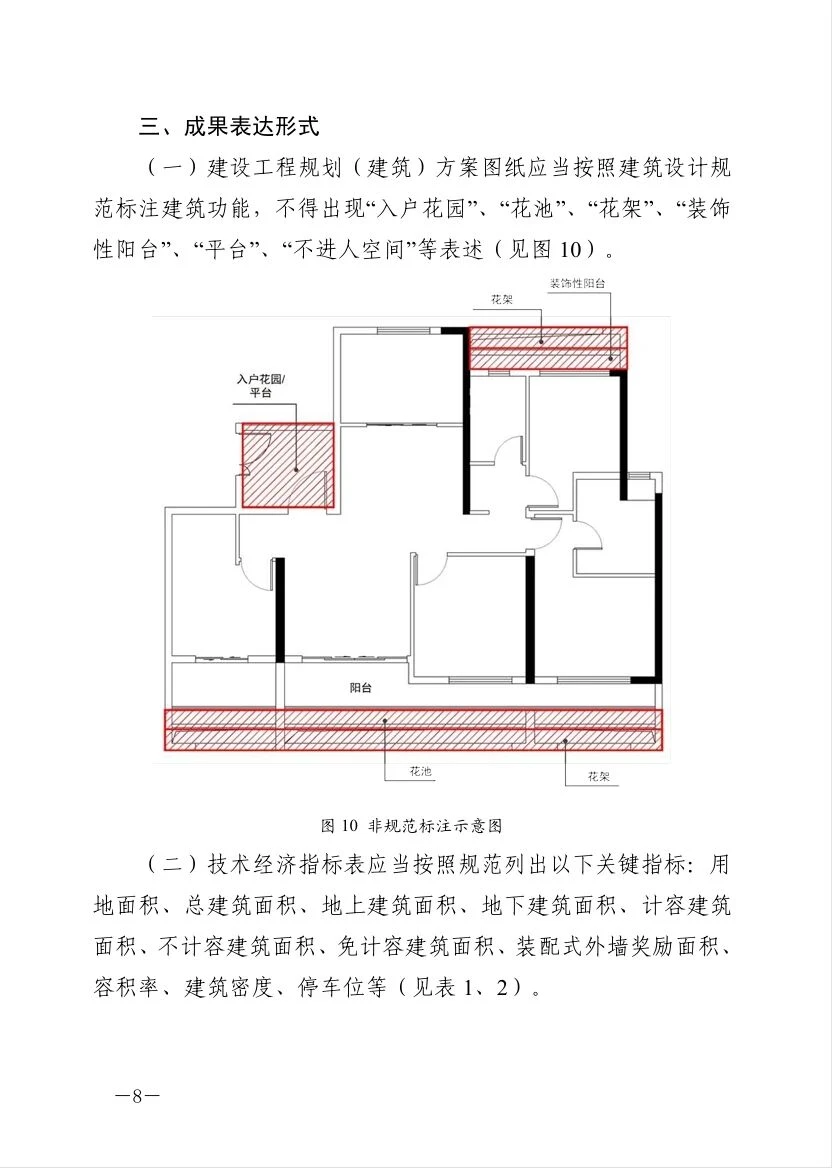 5️⃣建设工程规划(建筑)方案图纸应当按照建筑设计规 范标注建筑功能,不得出现“入户花园”、“花池”、“花架”、“装饰 性阳台”、“平台”、“不进人空间”等表述