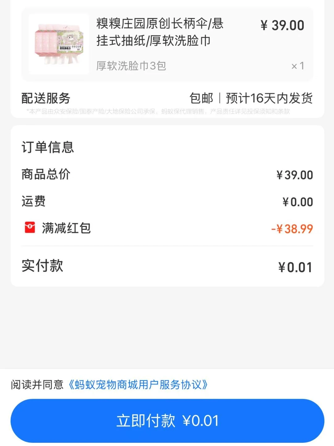 前几天给我家憨憨去支付宝买宠物医保的时候 发现它和糗糗庄园联名了,买完还送小礼品 抽纸/洗脸巾/雨伞可以任选一个 我选的抽纸,蛮厚实的,看得出材质很好 其实自己一直有关注糗糗庄园流浪猫救助视频的,这次歪打正着还支持了一波,真的很开心