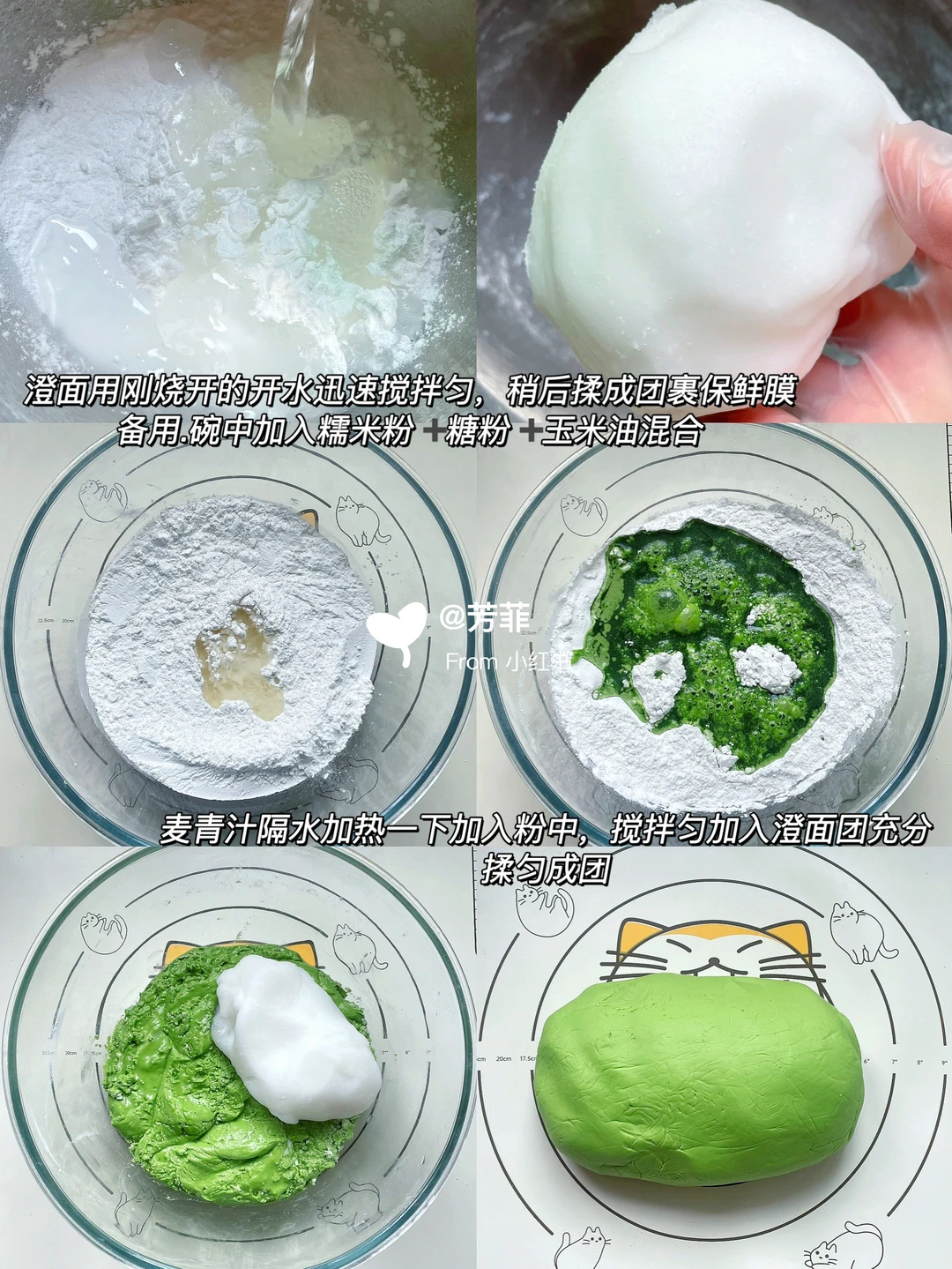 ⊳青团皮:澄面120克 开水200克 糯米粉400克 糖粉50克 玉米油20克 麦青汁350~370克(做其他颜色等量替换成温牛奶➕果蔬粉调色)