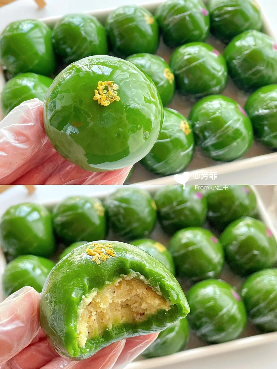 2️⃣桂花绿豆馅:脱皮绿豆提前浸泡,隔天蒸或煮熟压成泥.加砂糖奶粉炼乳混合,翻炒水分略收加黄油、桂花蜜翻炒匀,加干桂花混合(30克一个/约分12个左右)