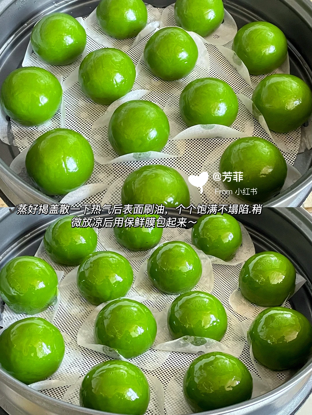 5️⃣青团皮分45克一个,馅30克一个.皮馅比例可按个人喜好调节.将青团皮按扁包馅收拢滚圆,水开上锅蒸8~10分钟,蒸好揭盖散热刷食用油温热裹保鲜膜