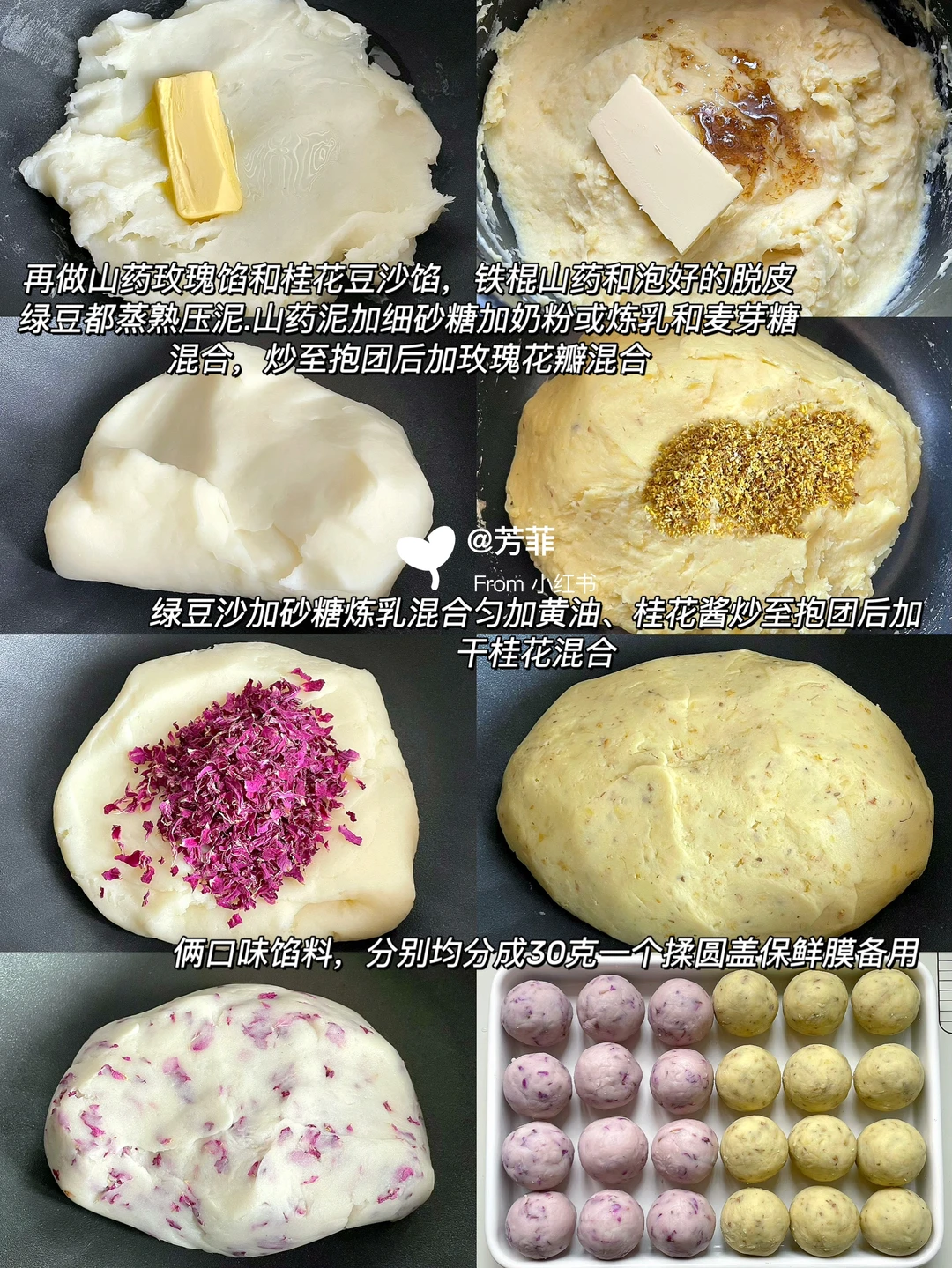 1️⃣先做馅料.山药玫瑰馅:铁棍山药蒸熟压泥,加砂糖奶粉混合后加黄油和水怡中小火翻炒,加玫瑰花瓣混合匀(30克一个/约分10~12个)