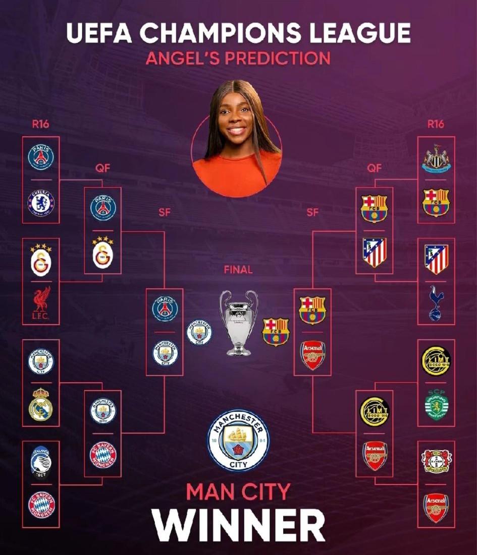 英国体育电台召集了七位专业主持人预测了一下欧冠走向,最后得出的结果:一个预测曼城夺冠,一个大巴黎、一个巴萨、两个阿森纳、两个拜仁。 下面图1是小编自己的预测,这其中最大的变数可能就是1/4决赛巴萨和马竞的西班牙内战了,马竞赢球也是非常有可能的。其他几场应该大差不差。 下面图2就是那位预测曼城要夺冠的主持人,曼城能在主场翻盘皇马,这位女主持人也是真敢想的!