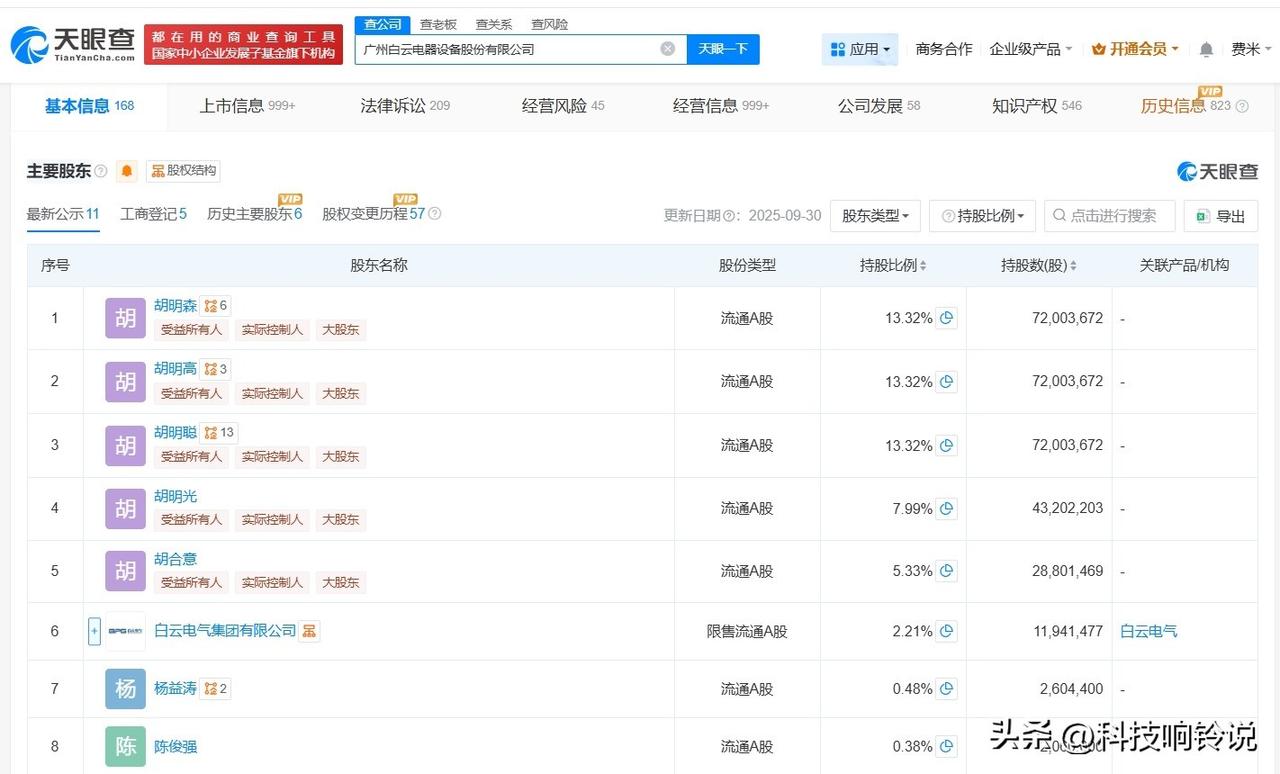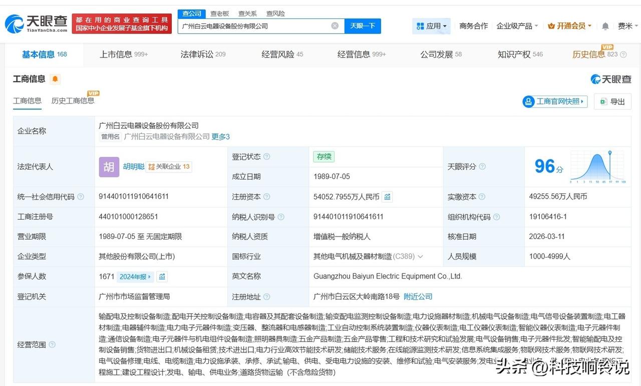 【白云电器增资至约5.4亿 胡明聪任白云电器法定代表人】 天眼查App显示,近日,白云电器(603861)发生工商变更,胡德兆卸任法定代表人,由胡明聪接任,同时,注册资本由约4.9亿人民币增至约5.4亿人民币,增幅约10%。 广州白云电器设备股份有限公司成立于1989年7月,经营范围包括输配电及控制设备制造、配电开关控制设备制造、电力设施器材制造等。股东信息显示,该公司由胡明森、胡明高、胡明聪等共同持股。 天眼查信息:
