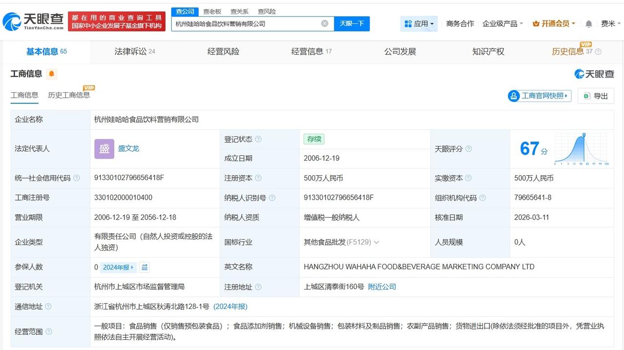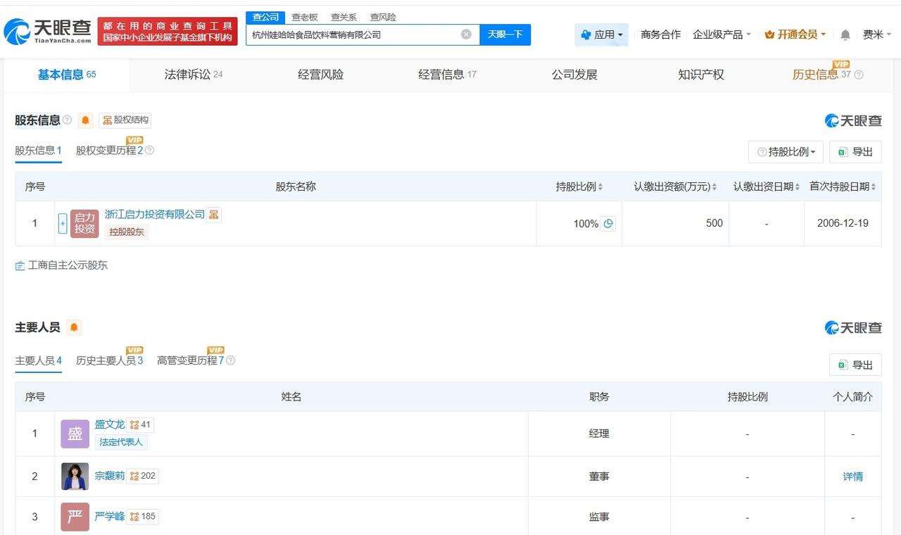 宗馥莉接手杭州娃哈哈食品饮料营销公司 宗馥莉任杭州娃哈哈食品饮料营销公司董事 天眼查工商信息显示,近日,杭州娃哈哈食品饮料营销有限公司发生工商变更,宗庆后卸任法定代表人、执行董事兼总经理,盛文龙接任法定代表人、经理,宗馥莉接任董事。 杭州娃哈哈食品饮料营销有限公司成立于2006年12月,注册资本500万人民币,经营范围包括食品销售、食品添加剂销售、机械设备销售等。股东信息显示,该公司由浙江启力投资有限公司全资持股。 天眼查信息: