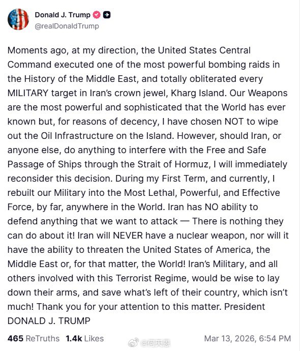 重大消息:特朗普宣称美国中央司令部对伊朗卡尔格岛进行了大规模轰炸行动,摧毁了军事目标。