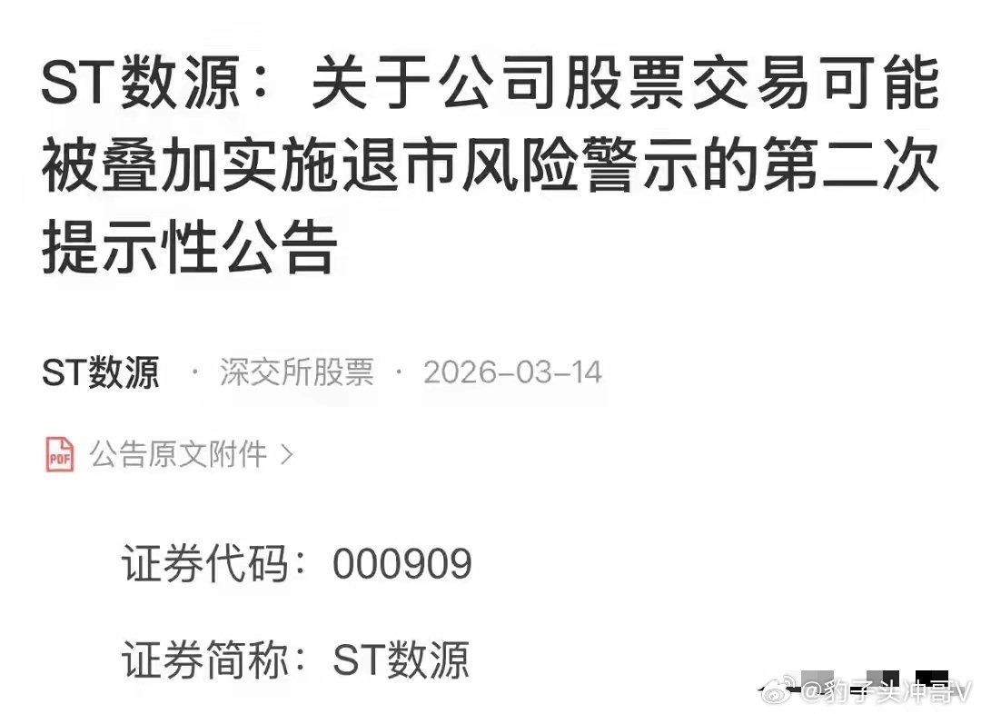 A股密集爆雷!2家公司立案调查12万股东踩雷,7家发退市风险公告A股市场风险警示密集来袭,昨夜多家公司集中披露利空公告:2家企业因信息披露违法违规被立案调查,波及12万股东;7家公司发布退市风险提示公告,其中3家面临终止上市危机,部分标的股价已从历史高位暴跌超95%,投资者需高度警惕“踩雷”风险。一、立案调查连发:12万股东遭双重打击1. 双良节能:一月内两度立案,股价腰斩近半作为光伏设备领域的知名企业,双良节能近期深陷合规危机。公司早在2月27日就因信息披露误导性陈述被立案调查,时隔半个月,控股股东又因相同类型的违法违规问题再次收到立案调查告知书,短期内利空叠加让投资者猝不及防。股价已率先反映风险,自首次立案公告发布以来,双良节能股价从11.56元持续下探至7.45元,区间跌幅高达36%,短期跌去三分之一以上。截至目前,公司仍有11.85万股东持股,不少投资者因前期跌幅较大选择补仓,却遭遇二次利空冲击,下周股价走势充满不确定性。2. 利尔达:抄底者被套,股东数量持续缩水另一家被立案调查的利尔达,近一个月股价同样表现惨淡。从15.77元跌至12.43元,累计跌幅达22%,尽管前期涨幅有限,但“跌跌不休”的走势让抄底资金纷纷被套,部分早入场的投资者浮亏已超10个点。公告显示,公司及相关当事人已收到立案调查告知书,而最新股东数据显示,公司现有1.18万股东,同比下降11.51%,这意味着前期被套的投资者已出现止损出逃迹象。根据《上市公司信息披露管理办法》,信息披露违法违规若查证属实,公司可能被实施ST处理,情节严重的将面临终止上市风险,后续需密切跟踪调查进展。二、退市风险高悬:7家公司拉响警报,3家濒临终止上市昨夜7家公司集中发布退市风险提示公告,涵盖财务指标不达标、连续亏损等多重问题,其中3家已第四次发布终止上市风险提示,退市压力陡增。1. 终止上市高危组:股价暴跌+业绩爆雷ST岩石:当前股价仅1.71元,较5年前的历史高位51.66元暴跌97%。公司已连续两年亏损,且营收低于3亿元,第四次发布终止上市风险提示公告,退市概率极高。ST国华:业绩预告发布后股价遭遇“断崖式下跌”,从12.62元跌至5.07元,期间出现19个跌停板,其中15个为一字跌停。尽管近期触底反弹,但公司连续四年亏损、营收不足3亿元的核心问题未解决,终止上市风险仍未消除。ST沐邦:成为风险公告中的“另类”,尽管已第四次发布终止上市风险提示,但近半年股价逆势上涨92%,当前股价9.79元。不过基本面风险不容忽视,公司连续两年亏损,2025年预亏9.3亿元且营收不足3亿元,退市风险实质性存在,股价与基本面的背离需警惕。2. ST预警组:连续亏损+营收不达标莫高股份:连续四年亏损,2025年业绩预告营收低于3亿元,已第二次发布ST退市风险警示公告,当前股价5.31元。集友股份:连续两年亏损,2025年营收预计不达标,第三次发布退市风险警示公告,股价在9.06元附近阶段性低位震荡。华谊兄弟:十年间股价从32元跌至1.70元,累计跌幅95%,公司已连续8年亏损,年报预告营收低于3亿元,且净资产可能为负,第二次发布ST风险提示公告,曾经的“影视巨头”深陷退市阴霾。ST数源:连续四年亏损,年报预告营收不足3亿元,已二次发布ST退市风险警示公告,持续经营能力存疑。三、风险提示:远离问题股,坚守价值底线从近期密集的风险公告来看,A股市场“退市常态化”趋势明显,财务不达标、信息披露违规成为触发风险的主要原因。根据监管规则,上市公司若存在连续亏损、营收不达标、信息披露违法违规等情形,将逐步触发ST、*ST及终止上市程序,投资者需高度重视以下两点:1. 谨慎参与立案调查及退市风险警示股,在相关问题未明确解决前,切勿盲目抄底或补仓,避免因股价持续下跌扩大损失;2. 聚焦基本面,选择业绩稳定、合规经营的标的,远离连续亏损、营收不达标、内控缺陷突出的企业,坚守价值投资底线。股市有风险,投资需谨慎。退市风险公告的密集发布,正是市场向投资者传递的风险信号,理性看待板块轮动与股价波动,方能规避不必要的损失。