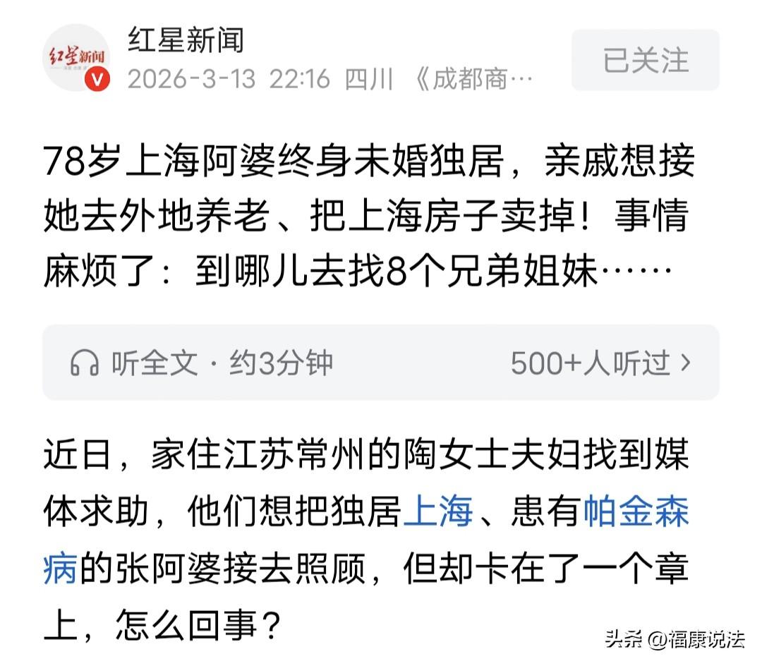 上海,78岁老人得了帕金森,无法走路只能坐轮椅,她一辈子未婚,无儿无女,外甥想把老人房子卖掉,带老人回家养老,可居委会表示:老人是限制行为能力人,外甥要先申请成为老人监护人才能卖房,可老人上面还有8个哥哥姐姐,也得征得他们同意,居委会才能盖章,律师又说要起诉立案,也得居委会同意材料才能走流程,这下陷入死循环了? 张阿婆78岁高龄了,住在上海闵行七宝一个老小区里。她这辈子没结过婚,也没孩子,年轻时候自己当女工、做小生意,日子过得一般。 前几年,阿婆被查出得了帕金森,一开始还能自己买菜做饭,慢慢的手开始抖,脚也抬不动,后来彻底走不了路了。 她每天只能坐在轮椅上,吃喝拉撒全靠保姆照顾。可阿婆每月退休工资才5000块,保姆光工资就要6800块,不够的部分都是外甥徐先生在补。 原来,徐先生是张阿婆大姐的儿子,住在江苏常州。前几年居委找到他,说阿婆没人管了。徐先生和妻子陶女士就经常开车来上海看阿婆,一来二去阿婆也动了心,觉得外甥可以依靠。 去年冬天,张阿婆彻底瘫在床上了。徐先生夫妇商量着,不如把阿婆接到常州去,身边有人照看,总比她一个人在上海强。 可张阿婆在上海的房子空着,每个月还要缴物业费,保姆也得花钱。徐先生就想把房子卖了,卖的钱都用来给阿婆养老。 可麻烦事来了,张阿婆因为帕金森影响,被判定为“限制行为能力人”,她自己不能签字卖房子。 如果,要处理张阿婆的财产,得先有人当她的监护人,负责帮她管钱管事儿。 按照法律规定,徐先生想当监护人,得先拿到阿婆住所地居委会的同意书。 可居委会一听就犯了难,张阿婆家里亲戚太多了,她排行老九,上面还有8个哥哥姐姐,有的已经不在了,有的在国外,连联系方式都找不到。 万一随便同意了徐先生当监护人,哪天冒出来个远房亲戚说“你凭啥他管钱”,居委会可担不起这个责任。 居委表示,这事儿我们第一次遇上,得把所有亲戚都找齐了,问问大家的意见才行。 可徐先生找了好几个月,有的亲戚去世了,连子女都移民了,根本联系不上。居委也没办法,只能让徐先生去法院起诉,让法院来查清楚阿婆的亲属关系,再决定谁来当监护人。 可律师说,这种案子法院一般不给立案,得先有居委会同意的材料才能走流程。 就这么一来二去,事儿就卡在这儿了,成了个“死循环”。 3月13号,居委的人上门问阿婆自己的想法。阿婆说话已经不太清楚了,只能含糊地表示:“房子给徐先生处理”。 可就算阿婆自己同意,居委还是不敢随便盖章——毕竟法律规定得找齐所有亲戚,谁也不想担责任。 有人说,其实很好解决,由居委会、亲戚和老人三方签协议,房子卖了,钱由政府监管,支付亲戚照顾老人的费用,亲戚只要能善待老人送终,老人去世后其剩余遗产由亲戚继承。否则,居委会有权收回亲戚对老人的监护与继承权。 也有人说,照这个问题展开看,现在老人万一去世,徐先生的付出就是白搭了。那今后对待独身老人哪个亲戚也不愿意管了,毕竟老人一没,法定继承人一大堆。 这事儿说起来真挺让人揪心的。徐先生夫妇本来是好心,愿意照顾无儿无女的阿婆,想把房子卖了给她养老,结果却被一个章卡在中间,动弹不得。 居委会的顾虑能理解,毕竟要是随便盖章,以后出了问题谁都担不起。可问题是,阿婆的身体已经等不起了。她现在连路都走不了,身边只能靠保姆照顾,万一哪天出点事儿,谁来管? 我觉得,居委会可以灵活一点。既然阿婆自己明确说愿意让徐先生管,而且徐先生已经照顾阿婆好几年了,不如先同意他当监护人,同时跟他签个协议:比如卖房子的钱必须用来给阿婆养老,定期向居委会汇报阿婆的生活情况。要是以后发现徐先生没做好,再撤销他的监护权不就行了? 再说了,徐先生要是图阿婆的房子,犯不着这么麻烦。他已经贴了好几年的钱了,要是真想要钱,早就可以不管阿婆了。别让程序上的条条框框,凉了那些真正愿意做好事的人的心。 从法律方面来看,徐先生夫妇愿意照顾无儿无女且患病的张阿婆,还打算卖房为其养老,这份心意十分难得。 张阿婆自己意识清楚时也明确表示让徐先生负责房屋买卖,可见她对徐先生夫妇是信任的。 如果,居委会担心其他亲属追责以及徐先生夫妇不履行赡养职责,这种顾虑虽有道理,但不能因噎废食。 老人身体状况每况愈下,时间不等人,若一直卡在程序上,老人的权益反而得不到保障。 居委会在出具同意书后,并非就撒手不管了,而是有监督职责。 若发现侵害老人权益的情况,可提出撤销监护权。 所以,居委会不妨灵活一些,在充分了解徐先生夫妇情况后,先同意其担任监护人,同时做好后续监督工作。这样既能让老人及时得到妥善照顾,也能兼顾财产安全,让情与法更好地融合。