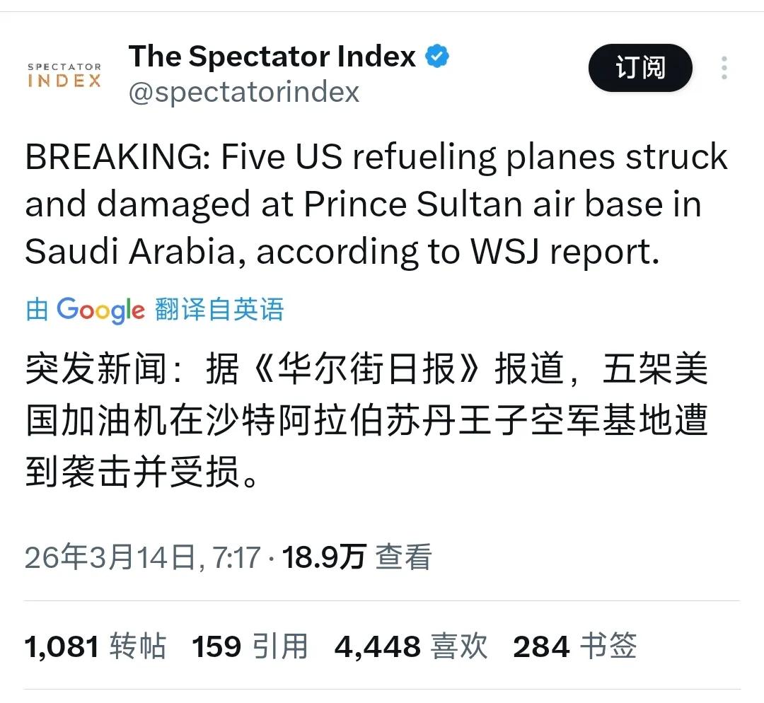 突发新闻:据《华尔街日报》报道,五架美国加油机在沙特阿拉伯苏丹王子空军基地遭到袭击并受损。” 伊朗打击美国在沙特五架加油机!说明伊朗最高领袖穆杰塔巴.哈梅内伊果然是强硬派言出必行,上任时曾发表讲话,我们绝对不会放弃为烈士的鲜血复仇,不光宣称继续关闭霍尔木兹海峡,还要求关闭美国在中东地区的基地,称这些基地将成为打击的目标。现在真的强硬的一步一步实现承诺,让美国遭受严重战损。 其实,看伊朗的行动策略,应该是准备跟美国打持久战,而打仗关键是打后勤。可见,伊朗的打法与上次冲突时明显不同,可能获得某些国家高人指点,搞得有章有法,“刀刀”截中美国软肋后勤补给、后勤支援力量,比如卡塔尔的乌代德空军基地及导弹预警雷达、巴林的补给基地等,这应该严重消耗美国打持久战的后勤资源保障能力。