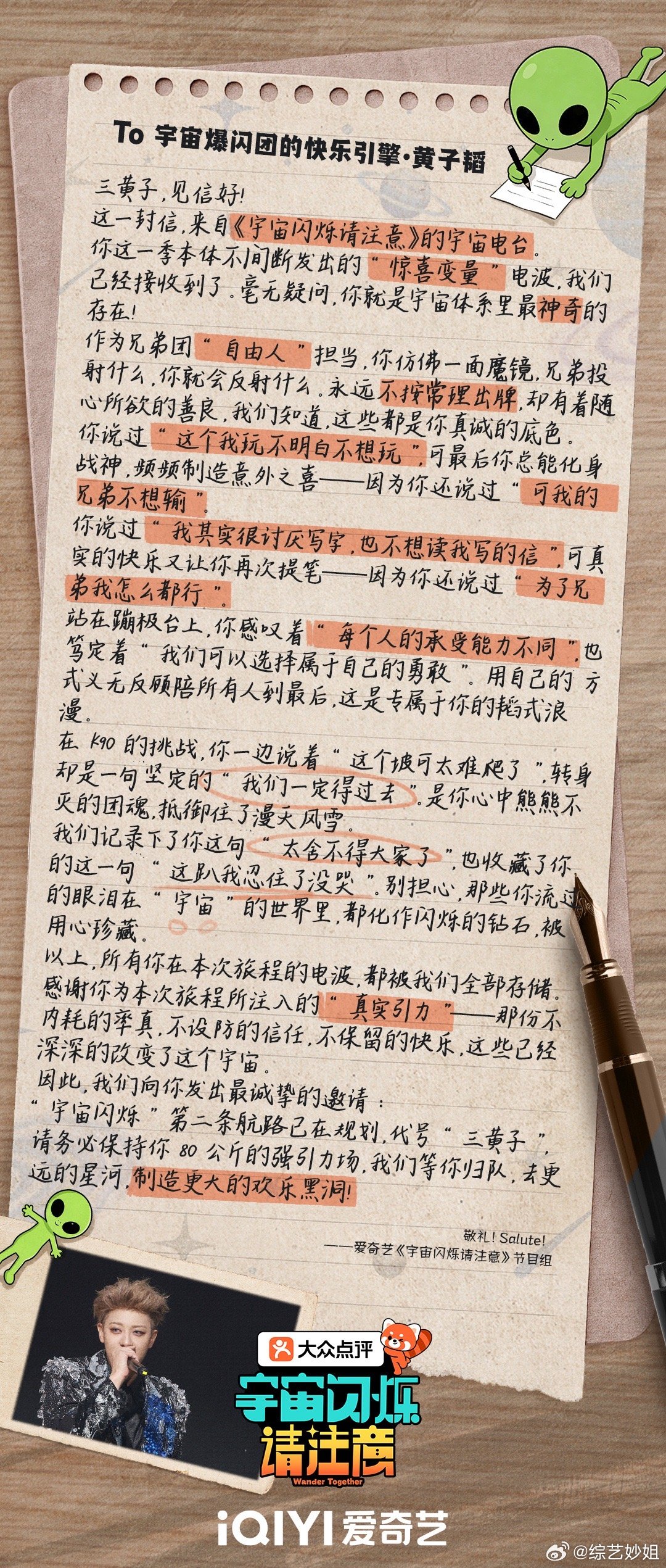 宇闪节目组写给黄子韬的信黄子韬录完宇闪瘦了20斤 宇闪节目组写给黄子韬的信好用心