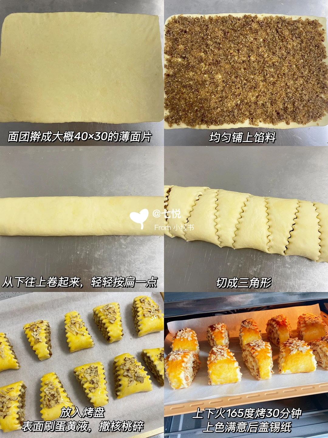 6️⃣切成三角形,放入烤盘,表面刷蛋黄液,撒核桃碎