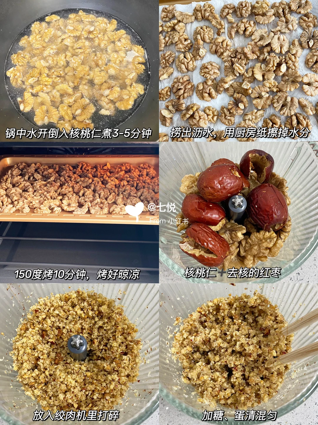 4️⃣处理好的核桃仁+红枣打碎,加糖、蛋清混合均匀