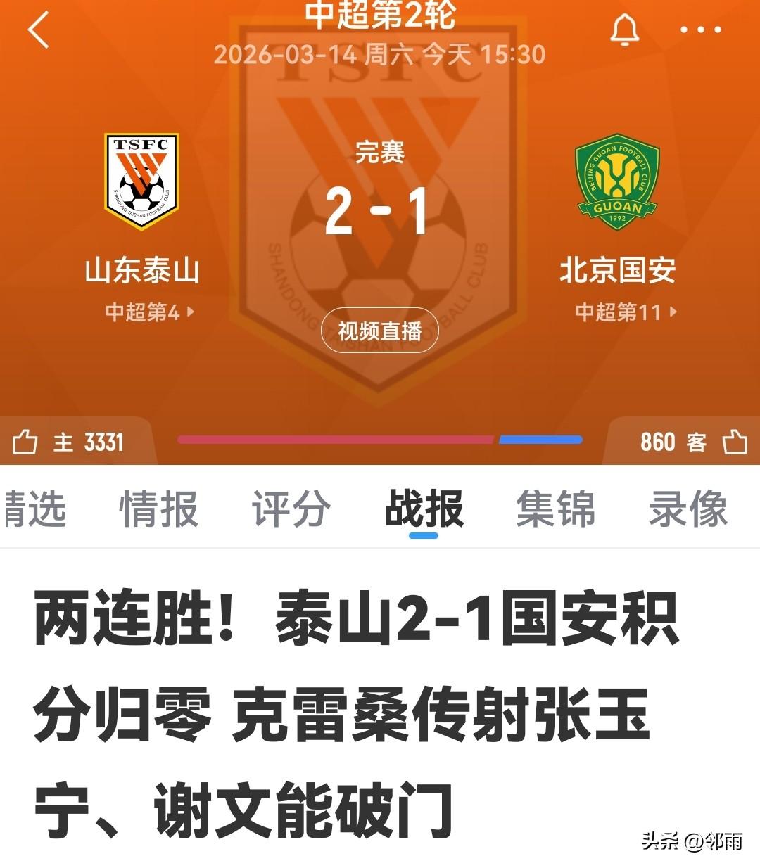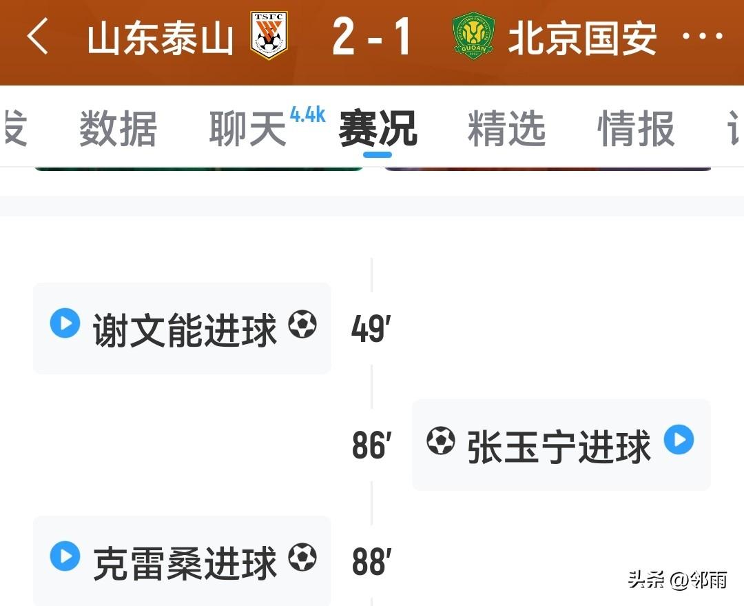 鲁京德比仅一球之差。 比赛精彩、激烈、刺激又漂亮。 韩鹏希望以1:0的比分坚守到终场。但张玉宁可不会答应,国安扳平比分,泰山队两分钟后再度超出,最终2:1获胜。 这场比赛充分表明,只要裁判不抢戏,让场上22名球员尽情施展才华,中超联赛就能踢出精彩且有滋味的足球。 泰山队依旧延续了执行教练韩鹏的技战术打法。下半场的变阵让国安有些不适应,这可不应该,谢文能的进球是显而易见的,国安队的年轻球员漏人酿成大祸。克雷桑助攻谢文能进球堪称经典,让谢文能达成每场进一球的表现。 泰山队定位球质量极高,李源一全场仅罚了一次定位球,就助攻克雷桑打进第二球。 国安队主教练很有能力,让18岁的青年才俊踢满全场,其胆量和坚持到底的信念令人佩服。