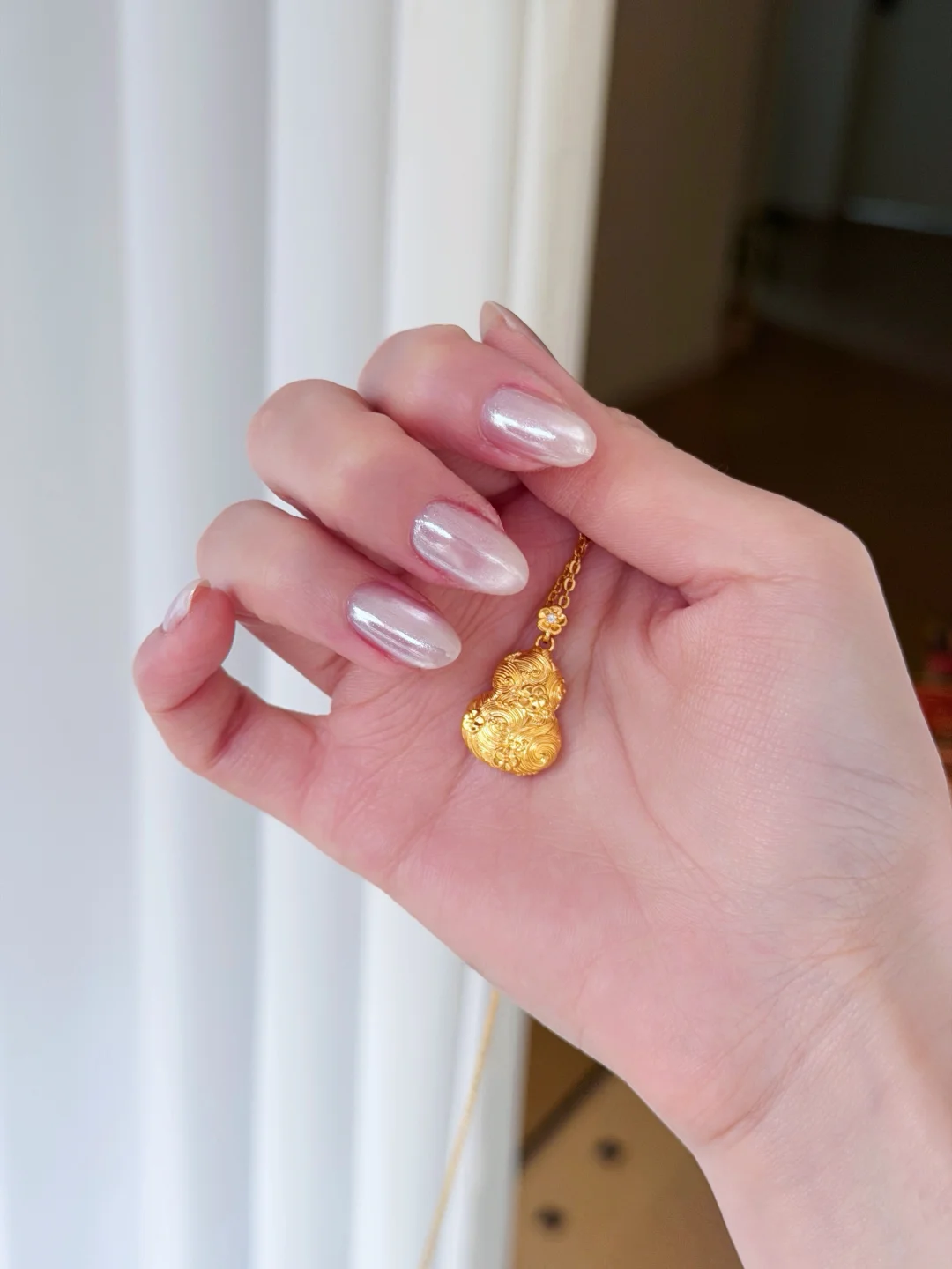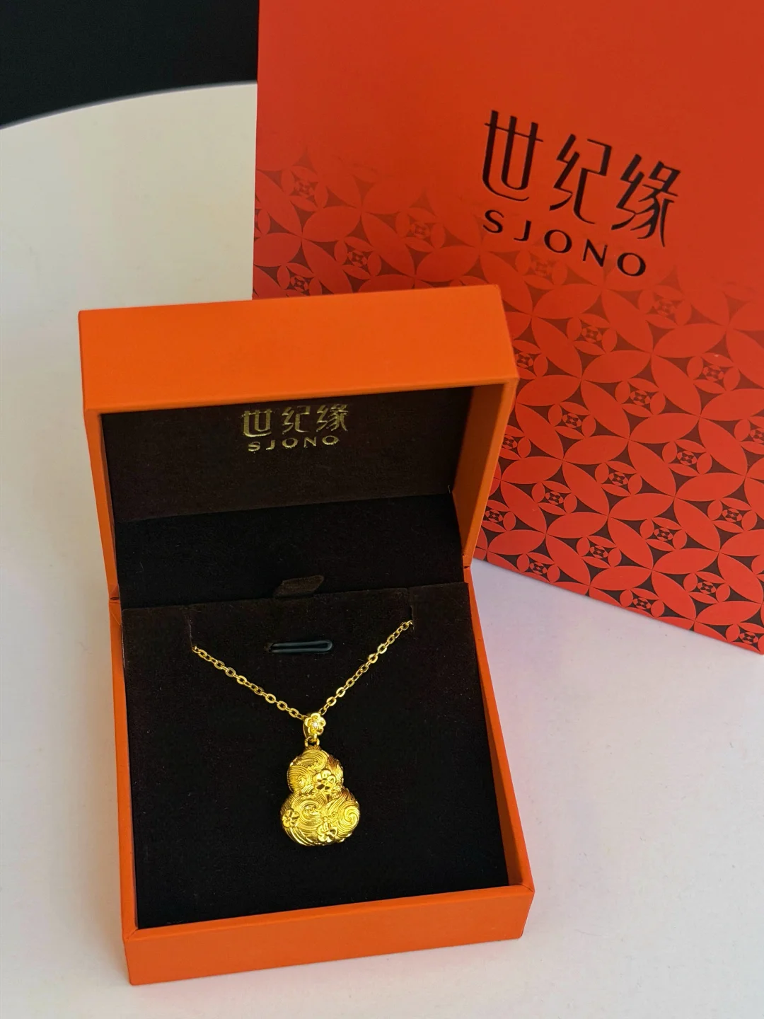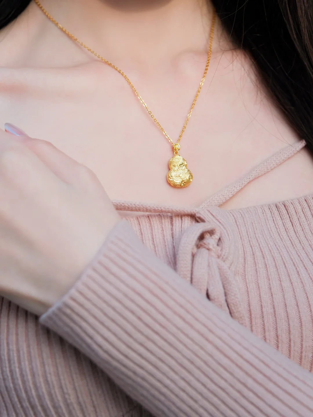 今天的精致矜贵感是项链给的 选对项链,修饰脖颈线条的同时气质提升真的不止一点点 黄金血脉觉醒!也是到了爱上黄金的年龄了 最近入手的这枚世纪缘桃花流水葫芦简直绝美 佩戴在锁骨间,日常又吸睛✨葫芦瓶身上绘着桃花与水波纹,微浮雕的线条层次清晰,光线下有柔和的温润光泽。 配一件简单的上衣,整个人灵动贵气,真的是越看越喜欢呀~