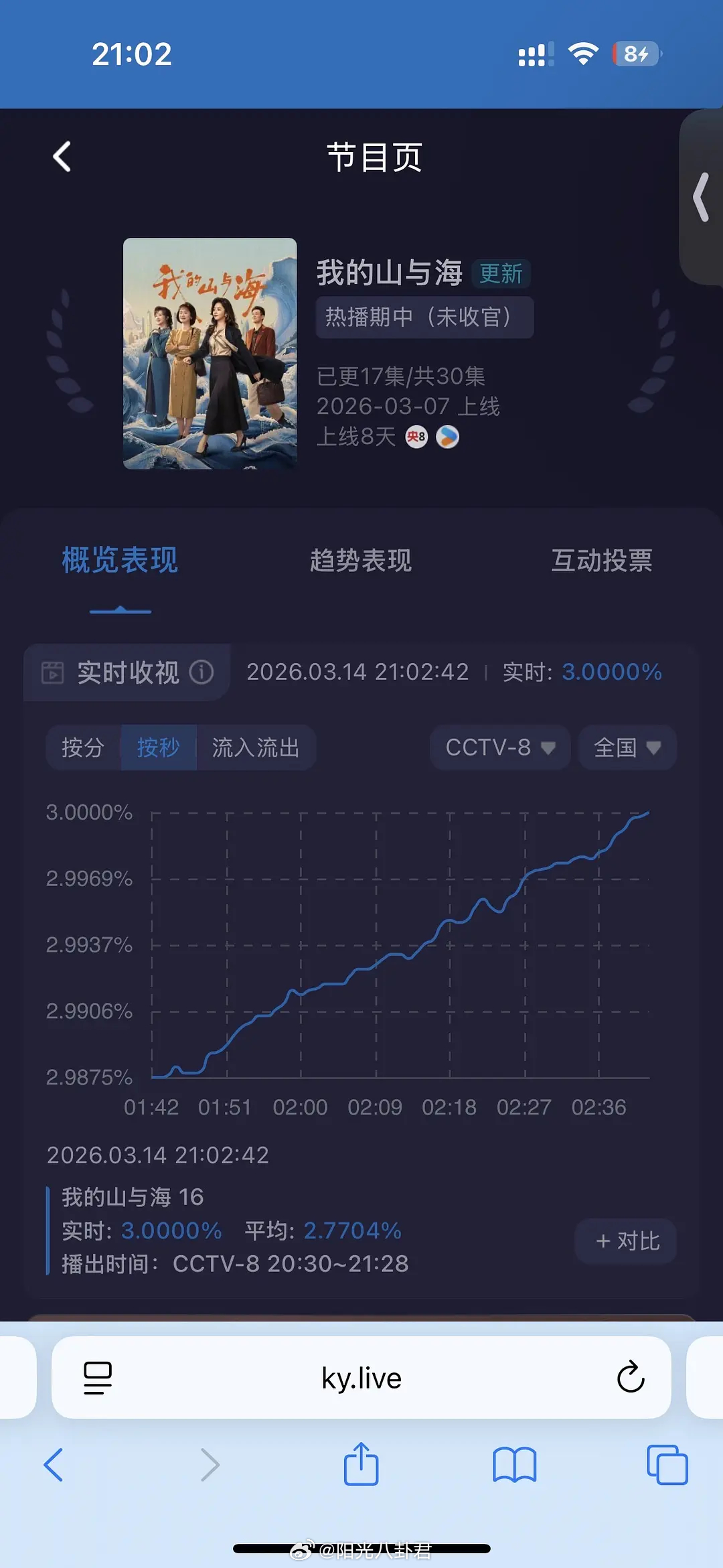 我的山与海第一集峰值已破2.91. 创26年央八酷云最高峰值 .已经超过今年最高峰值.今晚两集连破2.9和3.真的挺好看的,谭松韵也算转型了吧.她收视实绩貌似是90第一.不是一直在那种娃娃脸的类型里打转了。电视剧我的山与海