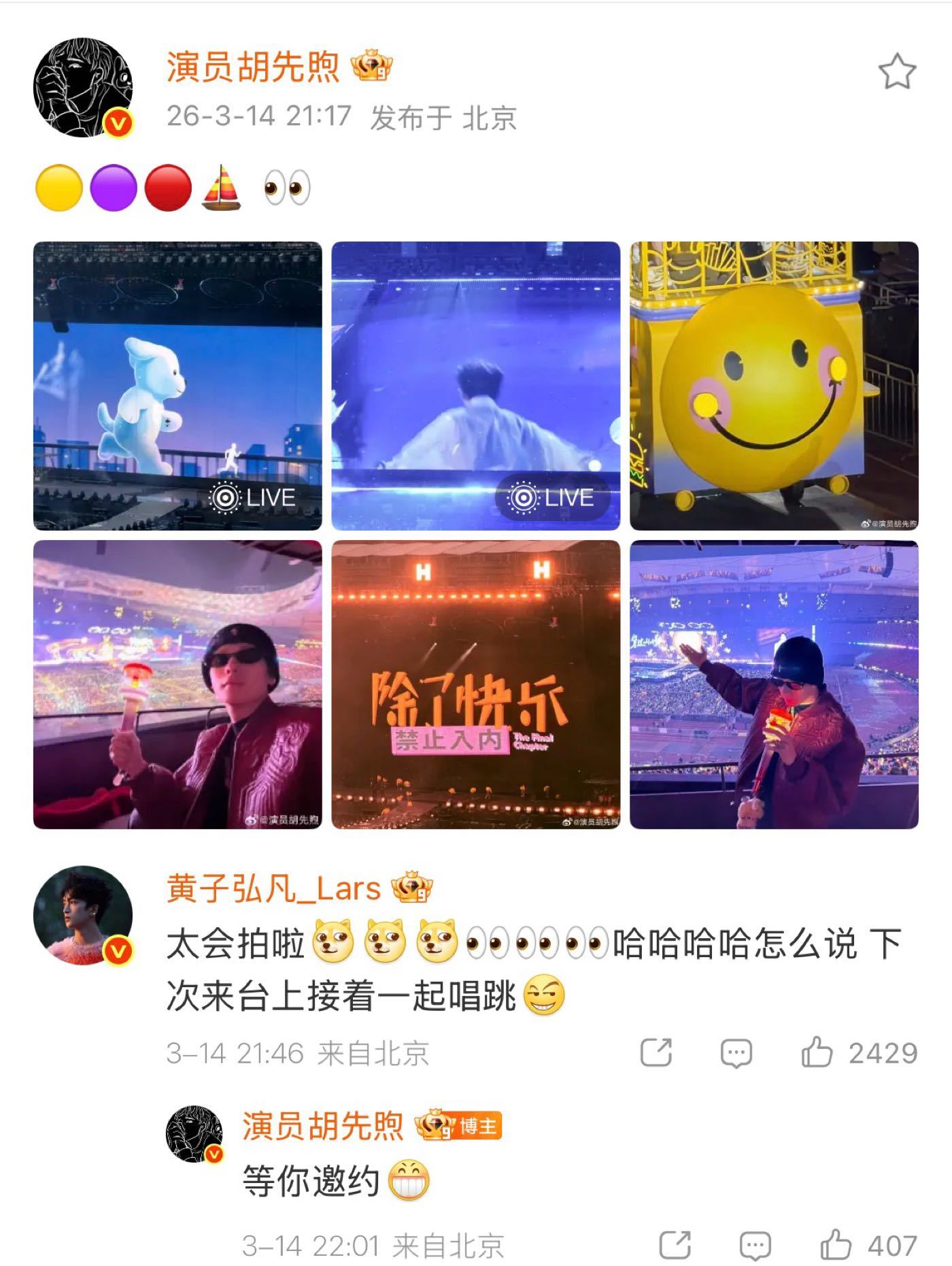 胡先煦看了黄子弘凡演唱会小蓝马祝小黄马演出顺利,呜呜是我们春晚认识的快乐小狗!就