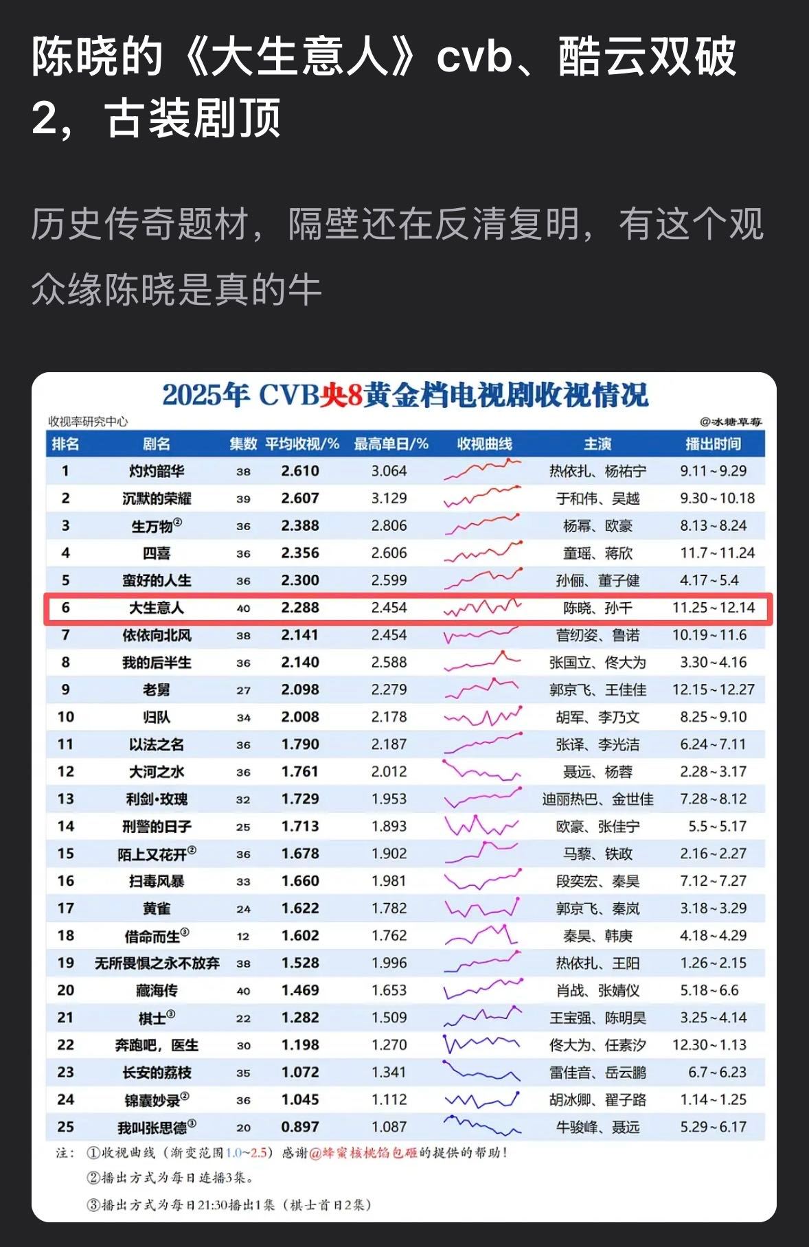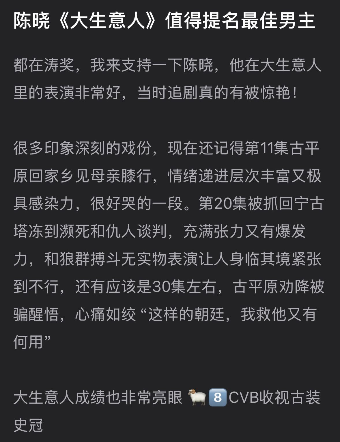 哇哦发现陈晓 的观众缘完全有迹可循😌大生意人去年的实绩没话说,cvb和酷云双双破2,一举登上央视古装剧史冠。央视也评语说打破了古装剧收视魔咒,创造最快破3纪录,含金量可想而知了……完全是靠硬实力堆出来的,陈晓演得好大家都有目共睹了,细腻地沉浸到人物之中,用细微的眼神勾勒出人物在绝望中追寻希望的处境,很牛很高级。看到有人期待哥提名一个视帝,真是也完全不意外,这样踏踏实实的品质演员是真值得!