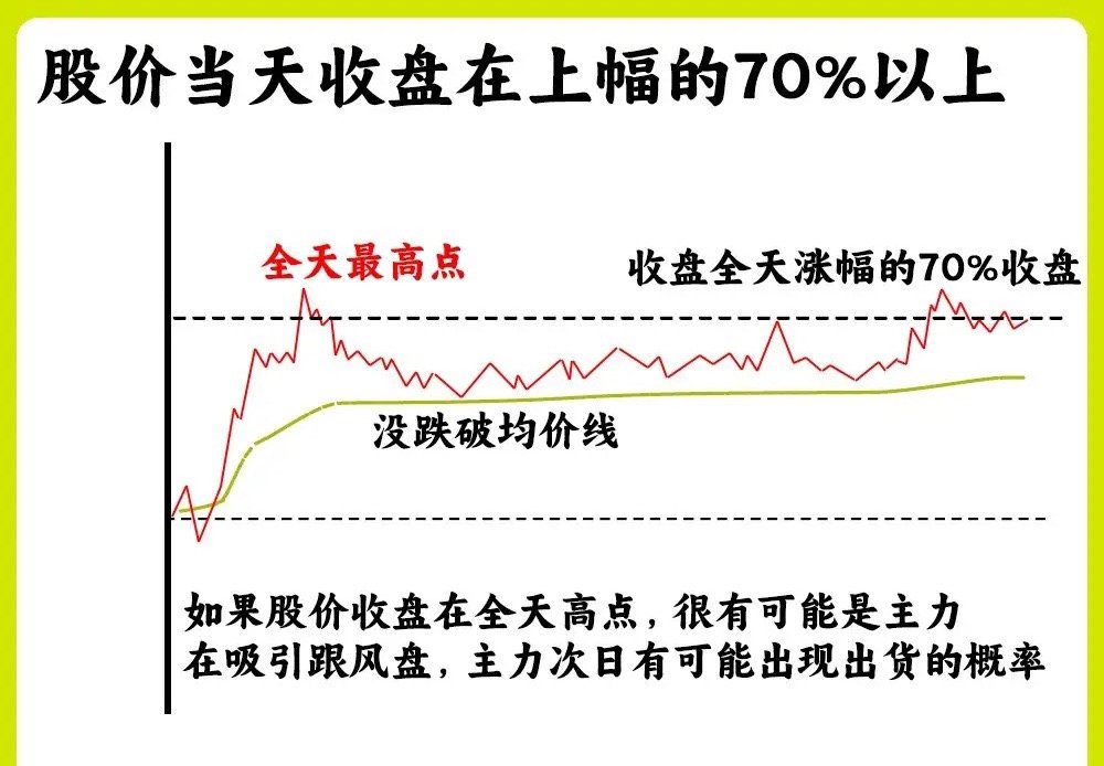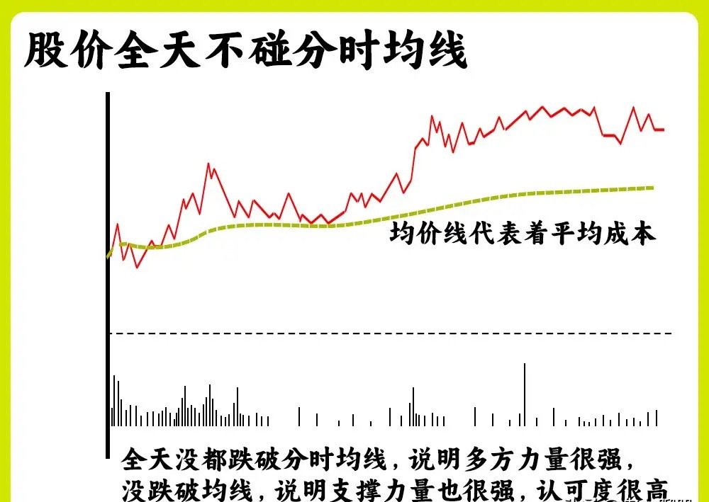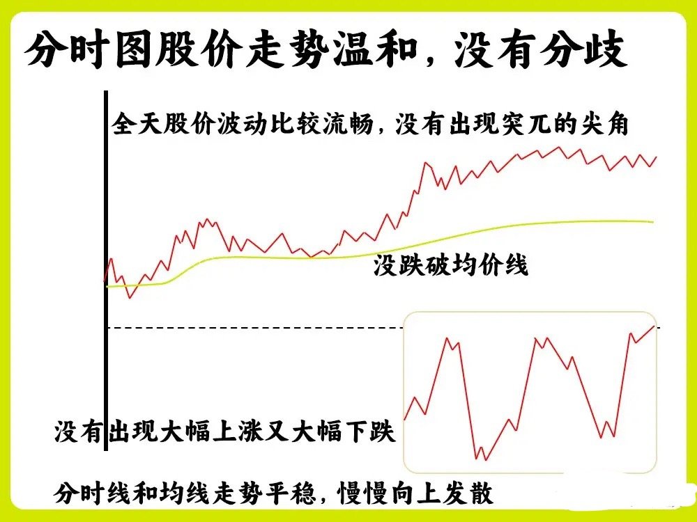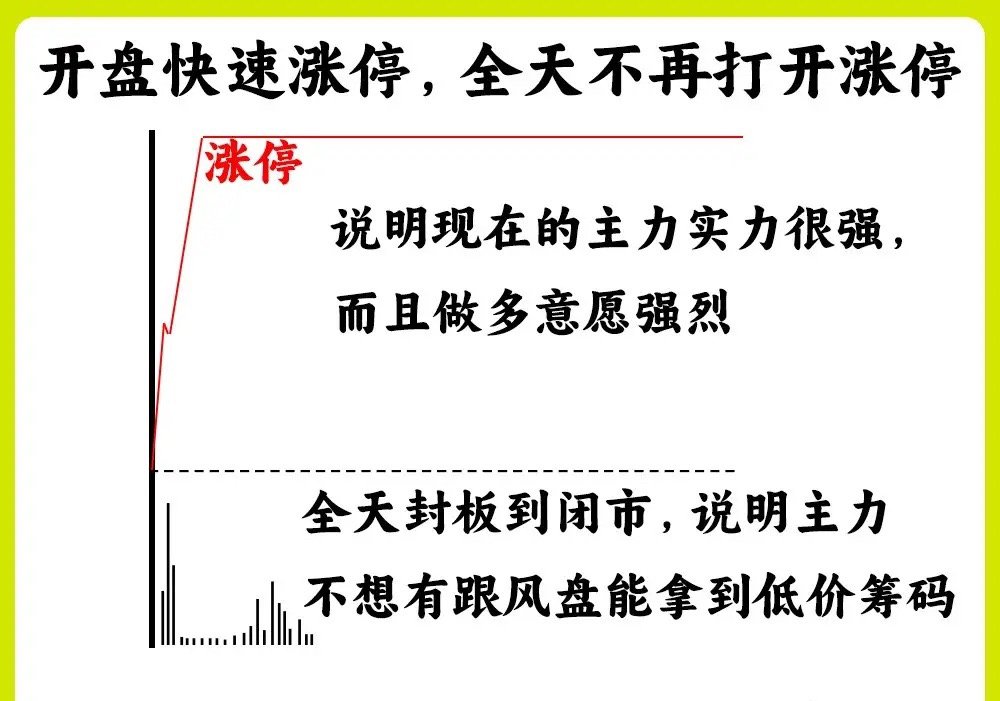 注意了!选股一定要选择强势股,而作为短线选手,首先要学会看的是就是分时图,如果分时图都不看,只看日K线,全天走势就特别的不直观。所以分时图是每一位短线选手都绕不开的一个重要视图。今天就给大家强势股怎么定义呢!归根结底就是买盘强于卖盘。所以这六种形态一定要知道一、开盘快速涨停,全天不再打开涨停早上开盘以后,股价快速拉升,拉到涨停,全天没有出现炸板回落,盘口有大量封单量,这就是典型的强势,全天几乎没有给市场多余的考虑时间,直接涨停,所以我们在复盘的时候,就会发现这种涨停时间往往都会比较早,会在10点之前二、股价全天不碰分时均线分时图里股价在上涨,均价线在股价下方,不管股价是否有下跌,几乎都会碰到均价线或是碰到均价线以后快速反转向上,更不可能出现破位的情况。买盘始终强于抛盘三、分时图上上涨放量,下跌缩量在分时图里,股价出现上涨,下方成交量就会出现放量,而股价出现回调,成交量就会出现明显缩量,这个经典量价关系是最为健康的。回调往往是主力短期洗盘四、分时图股价走势温和,没有分歧在分时图里,股价温和上涨,股价没有出现大起大落,说明此时市场情绪比较一致,多有多少多空博弈,抛盘比较少。五、股价当天收盘在上幅的 7% 以上股价全天都在高位运行,尾盘没有出现跳水情况,到了收盘,股价能稳稳在上涨的7%以上,说明多头比较强。六、股价阶段式逐步抬高在分时图里,股价先是横盘,再拉升,在横盘,在拉升,成交量出现横盘缩量,上涨放量,这样走势,说明主力比较稳健,横盘就是主力短期洗盘。所以就走出阶梯式上涨好了!以上就是强势股的分时图,下方财哥准备了六种对应的案例图。希望对大家有启发,也是最为基础的内容,一定吃透。我们下期内容再见