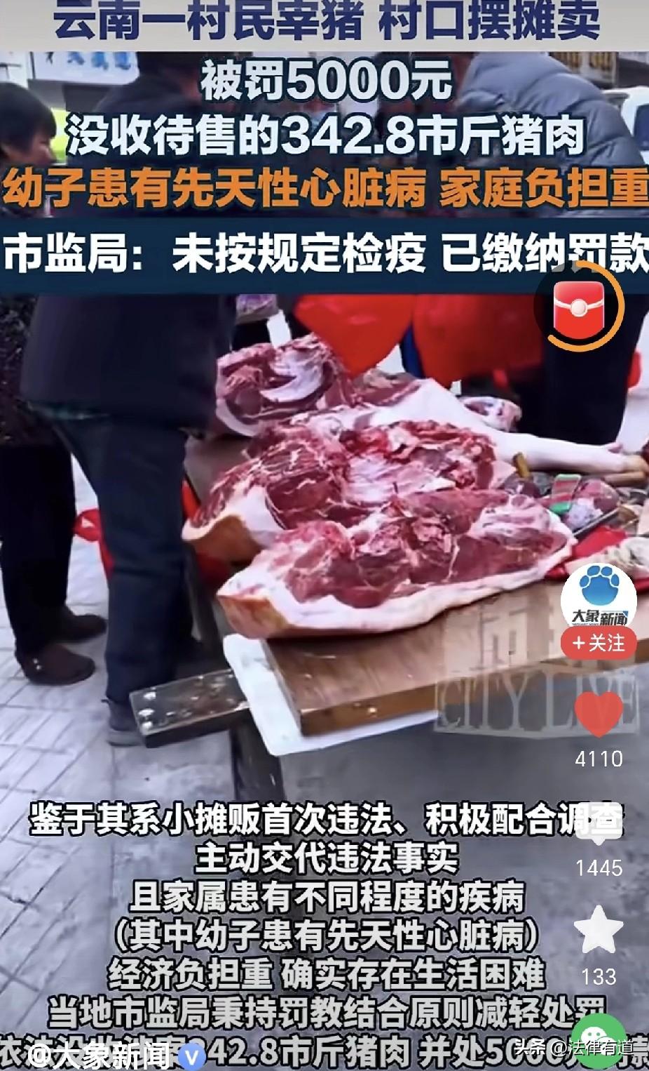 当5000元罚款压垮一个家庭,一场宰猪罚单背后的法理与人情:48岁的村民杨某艳,因为把自己买的猪宰了拉到村口卖,被市场监管部门罚款5000元,并没收了全部342斤猪肉 。 时间回到2026年1月13日,砚山县江那镇子马社区狮子山小组的村入口处,杨某艳像往常一样支起了她的鲜猪肉摊点。她或许还在盘算着,这300多斤肉按10.5元一斤卖掉,能给孩子多攒点药费。 然而,她等来的不是顾客,而是市场监督管理局的执法人员。检查中执法人员发现,摊位上待售的猪肉胴体上,没有加盖生猪屠宰检疫验讫印章和肉品品质检验合格章,杨某艳也无法提供相应的《动物检疫合格证明》和《肉品品质检验合格证》。 进一步调查还原了这批猪肉的“前世今生”:前一天,杨某艳在砚山县的生猪市场买了一头毛猪。次日凌晨,她在自己家中进行了宰杀,得到鲜猪肉约358.8斤,自留了16斤后,将剩下的342.8斤拉到村口准备售卖 。 她也许不知道,正是“在家宰杀”这个在农村延续了千百年习惯的动作,让她站到了法律的对面。 根据《中华人民共和国食品安全法》第一百二十三条的规定,经营未按规定进行检疫的肉类,货值金额不足一万元的,并处十万元以上十五万元以下罚款 。 按此标准,杨某艳的猪肉货值金额为3767.4元,法定最低罚款额度是10万元。但最终的处罚决定书上,数字定格在了5000元,同时没收涉案猪肉。 为什么是5000元?砚山县市场监督管理局的一纸回应,揭开了这个家庭难以承受之重:杨某艳属于小摊贩,是首次违法,案发后积极配合调查。更重要的是,她的家属患有不同程度的疾病,其中年幼的儿子患有先天性心脏病,家庭经济负担极重,确实存在生活困难 。 于是,在“法理”与“人情”的天平上,执法部门最终选择了“减轻处罚”。这5000元,已经是法定10万元门槛之下的“法外开恩”。 但它对于这个有先天性心脏病患儿的家庭来说,依然是一座大山。 @法律有道 一、为什么自家宰的猪不能卖? 在评论区,或许有很多人不解:“我自己养的猪,自己杀的,吃了几辈子了,怎么现在卖就是违法了?” 这背后,是我国对食品安全建立的生猪定点屠宰制度。 根据《生猪屠宰管理条例》,国家实行生猪定点屠宰、集中检疫制度。除了农村地区个人自宰自食的猪肉,任何未经定点的单位和个人都不得从事生猪屠宰活动 。 这一制度的设立,是为了在源头上切断病死猪肉、注水肉流向餐桌的通道。在正规的定点屠宰场,每头生猪进场前要查证验物,屠宰过程中要经过头部、内脏、胴体等同步检疫,合格后才加盖两章(检疫验讫印章、肉品品质检验合格章),并出具两证(《动物检疫合格证明》、《肉品品质检验合格证》)。 杨某艳在家中屠宰的猪肉,由于缺乏这一系列监管流程,其生猪来源是否安全、肉品是否携带病菌或兽药残留,都成了未知数。法律之所以设定高额的罚款门槛,正是因为未检疫的肉类存在极大的食品安全隐患 。 二、本案不只是“罚”与“不罚”,裁量决定了执法与民生。 如果我们横向对比其他案例,更能看出这5000元罚款的“特殊”。 在新化县,村民康石华同样因未经定点从事生猪屠宰活动,被没收猪肉和工具,并被处以5万元罚款 ;在贺州市,莫某因销售未按规定检疫的猪肉(货值696元),最终被没收违法所得并罚款3000元 。而在浙江台州,农民应义红因宰杀家养猪售卖收款700元,最初被罚5万元,后在法律援助下才改为罚款5000元 。 同样是私宰售肉,处罚金额从3000元到5万元不等。这其中的差异,正是行政处罚裁量权的体现。 砚山县市监局在决定书中引用了《行政处罚法》中关于“应当从轻或者减轻行政处罚”的情形 。杨某艳案中,当事人家庭极其困难、积极配合调查、属于首次违法且猪肉并未售出(社会危害性较小),这些因素共同构成了“减轻处罚”的充分理由。 三、当“生存”遇到“安全”,如何平衡。 这起事件,在网络上再次掀起了关于“小过重罚”与“人性化执法”的讨论 。 一方面,我们必须为市场监管部门守住食品安全底线的决心点赞。他们不因为是在偏远村口摆摊就视而不见,这是对更多消费者负责。另一方面,当执法的对象是一个为了给孩子筹措医药费而铤而走险的农村妇女时,单纯的“严刑峻法”又显得过于冰冷。 值得庆幸的是,在这起事件中,我们看到了执法者在法律框架内的温情与理性。他们没有机械地套用10万元的起步价,而是深入调查当事人背景,综合考量,给出了一个既体现法律威严,又兼顾人道主义的处罚决定。 杨某艳的罚款已经缴纳 。但这5000元买来的教训,或许不仅仅是“不能私宰卖肉”这么简单。它更提醒我们,在法治社会里,如何让法律在执行过程中,既能精准打击危害公共安全的违法行为,又能为那些在生存线上挣扎的家庭,留下一丝喘息的缝隙。 这或许正是这则新闻除了食品安全之外,留给我们更深的思考。