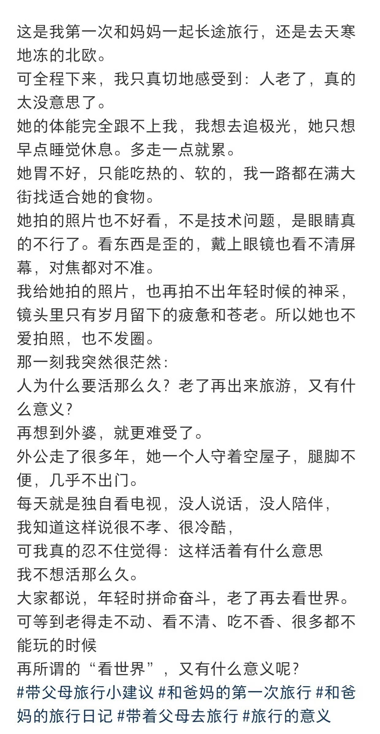 如果这么说,那妈妈带小时候的你旅游也没有意思,能去的地方太有限,能吃的东西也有限,你脚力不行妈妈还老得抱着你,风景啊人文啊小孩都不感兴趣,生活不能自理,各种照顾伺候事儿一堆。你妈那会儿倒是年轻想去更好玩的地方旅游呢,被你拖累了不是。