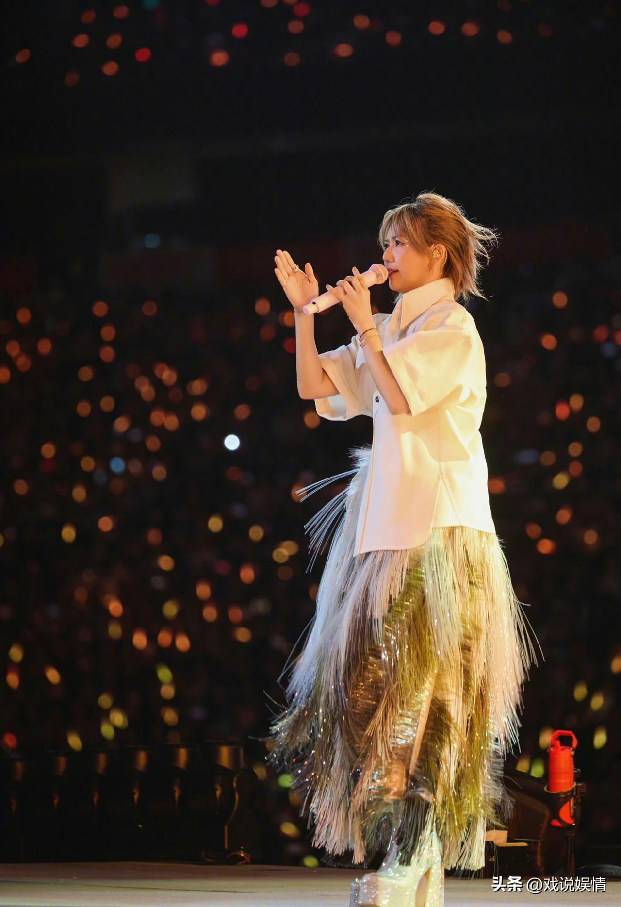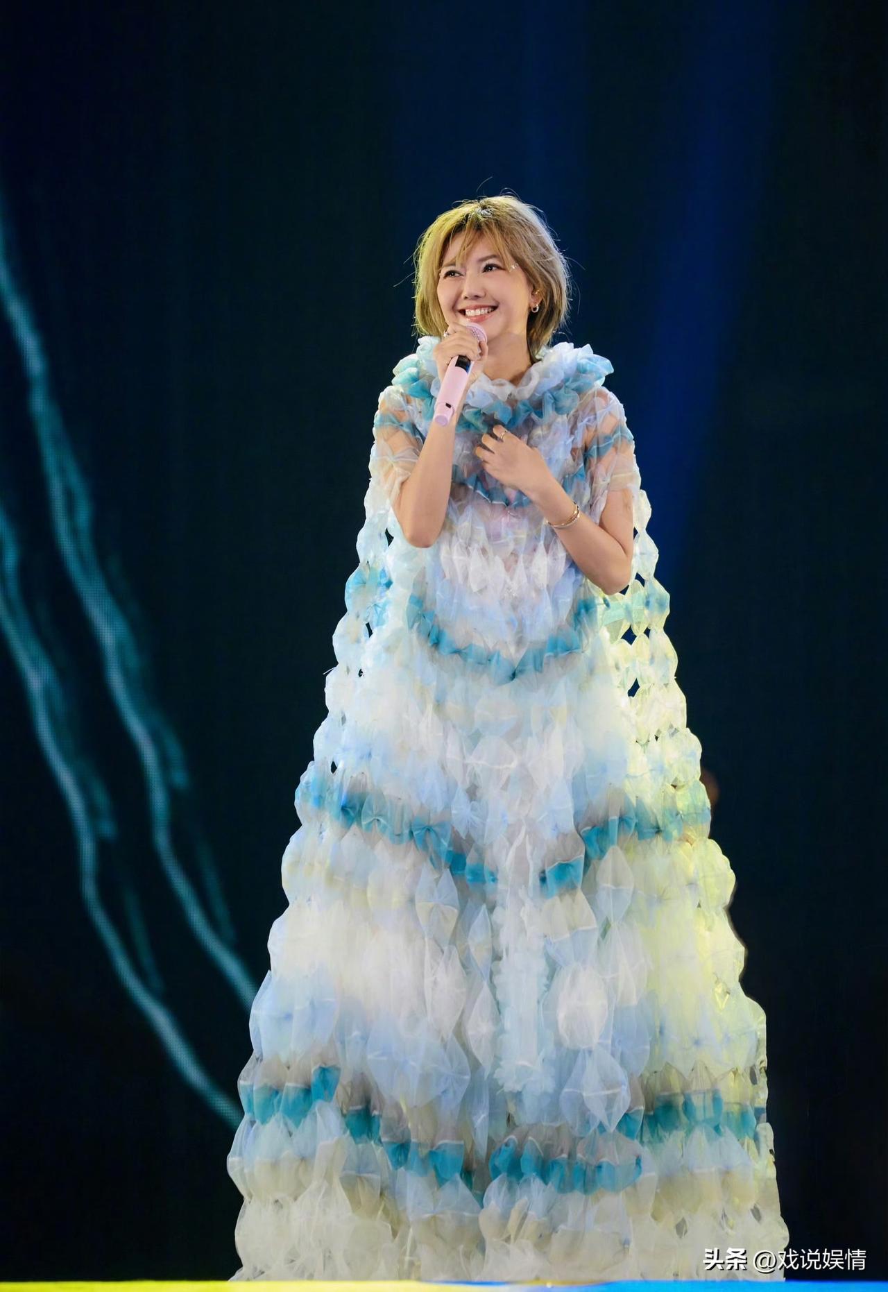 与某些女歌手比,孙燕姿的演唱会服装相当保守了吧! 这是孙燕姿在《就在日落以后》巡回演唱会上的舞台瞬间。 孙燕姿留着金色短发,第一张造型中她身穿白色尖刺状蓬松长裙,无数根细长的亮面材质向外炸开,像一团发光的海胆或蒲公英;第二张造型中她穿着一件层次丰富的蓝白渐变立体长裙,裙身由大量半透明的菱形褶皱面料堆叠而成,像层层叠叠的海浪或轻盈的羽毛,蓝白渐变的色调清新又梦幻,整体造型既灵动又充满仙气。 与穿着很暴露的其他女歌手相比,孙燕姿已经相当保守了吧!