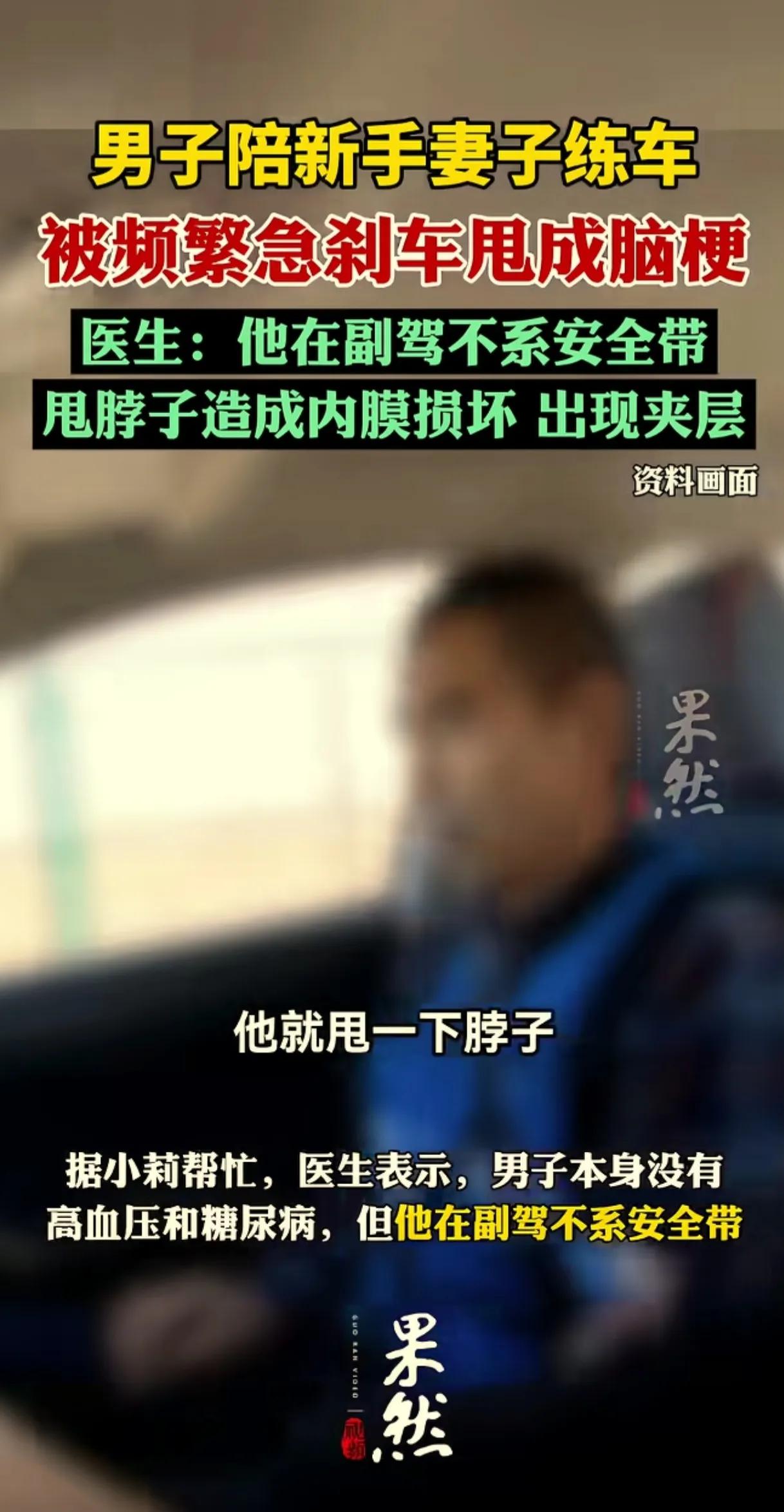 河南郑州一女子刚领驾照,迫不及待的练车,丈夫陪同坐副驾驶,没有系安全带。 妻子由于紧张,频繁急刹车,每次刹车,男子就会不由自主的甩一下脑袋。 下车后男子竟然得了脑梗,平时他的身体都是健康的,没有基础病,没想到陪老婆练车导致脑袋晃动,晃出血管内膜损坏,出现夹层继发脑梗。 男子才30来岁,正值壮年,也经不起频繁刹车的颠簸,以后怕是再也不敢坐副驾驶,让他老婆开车了。