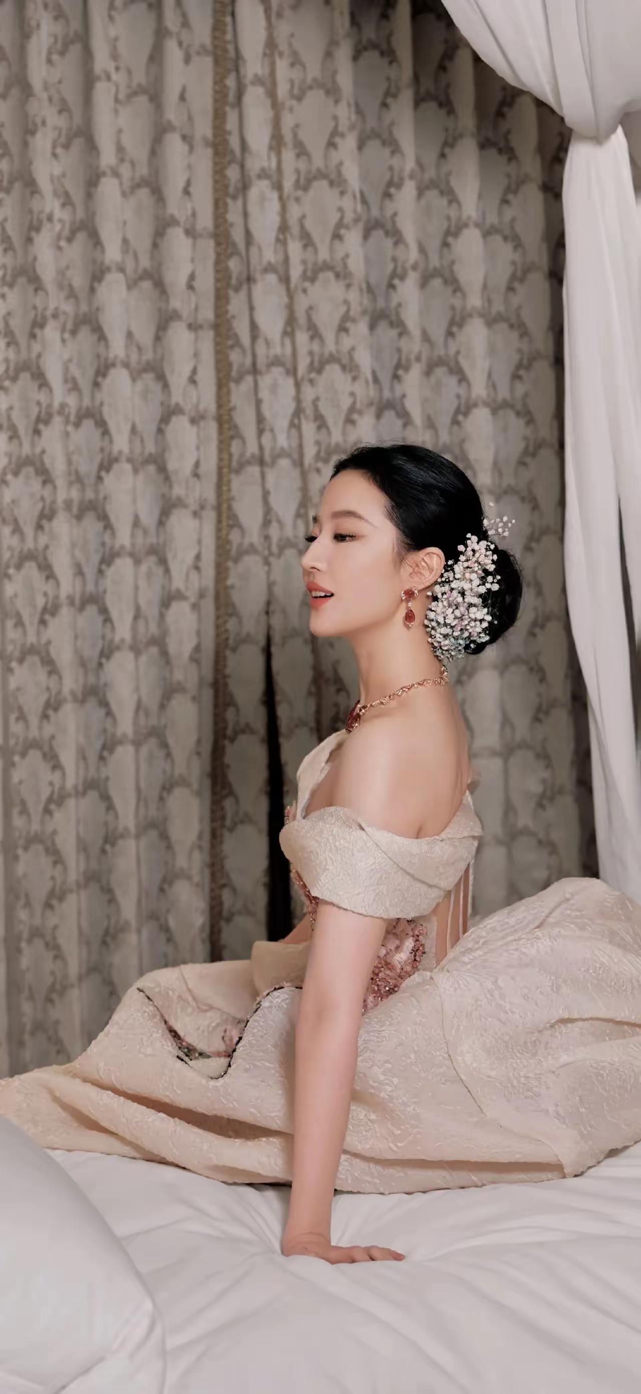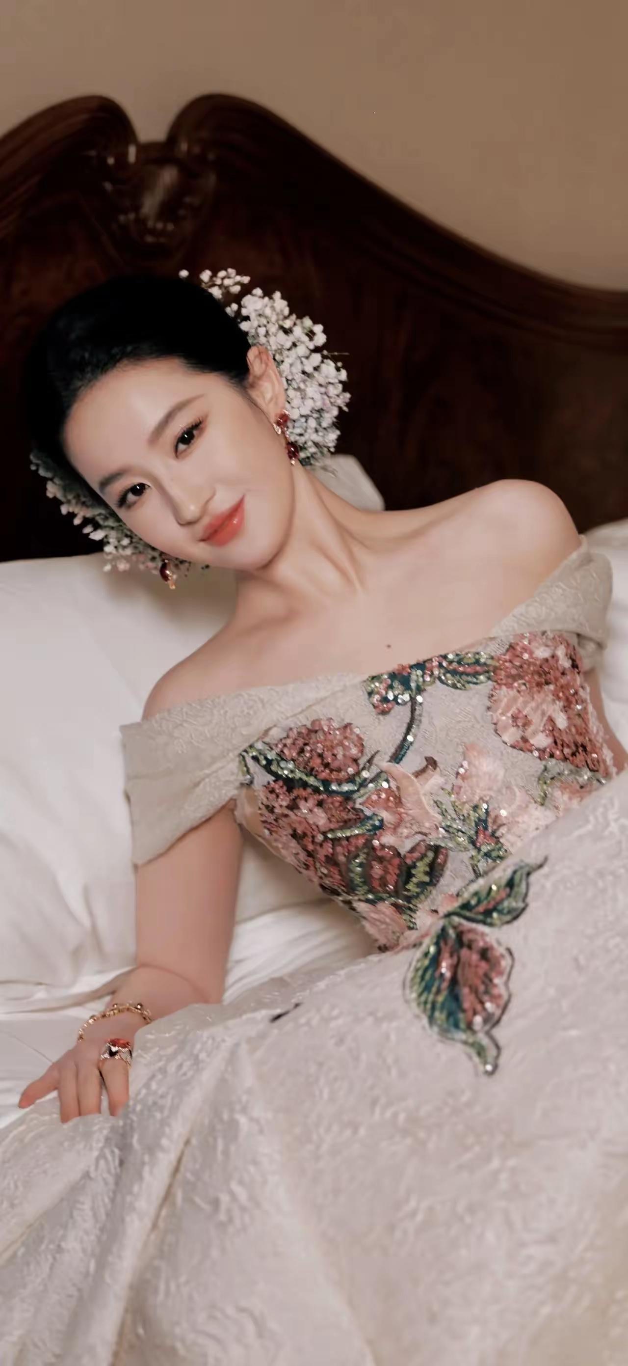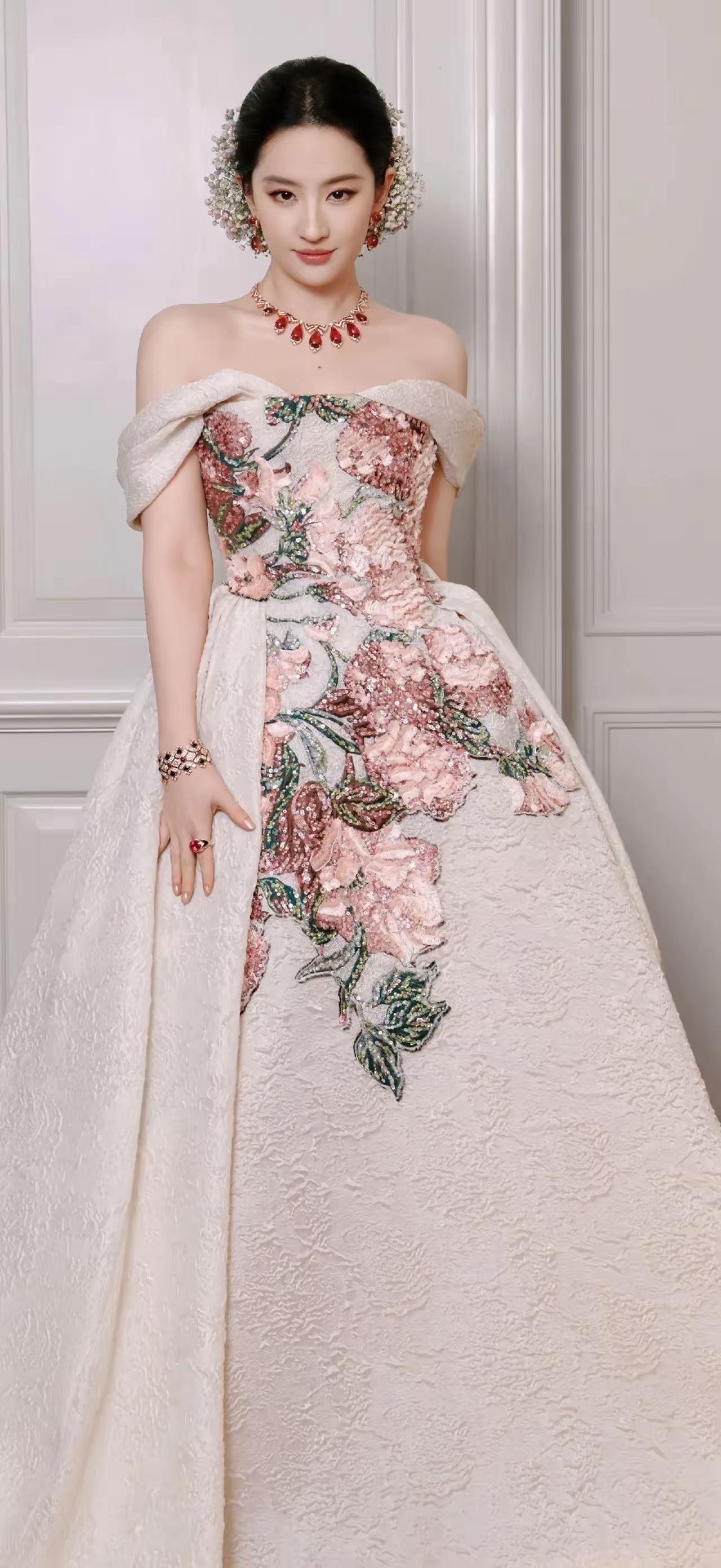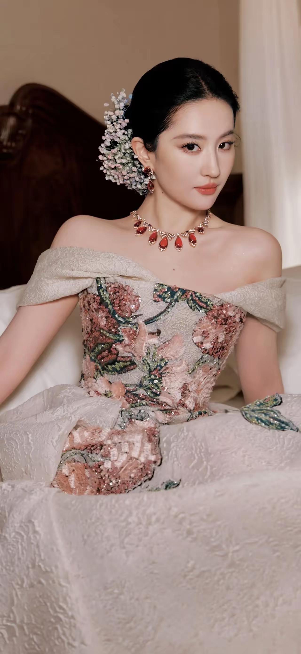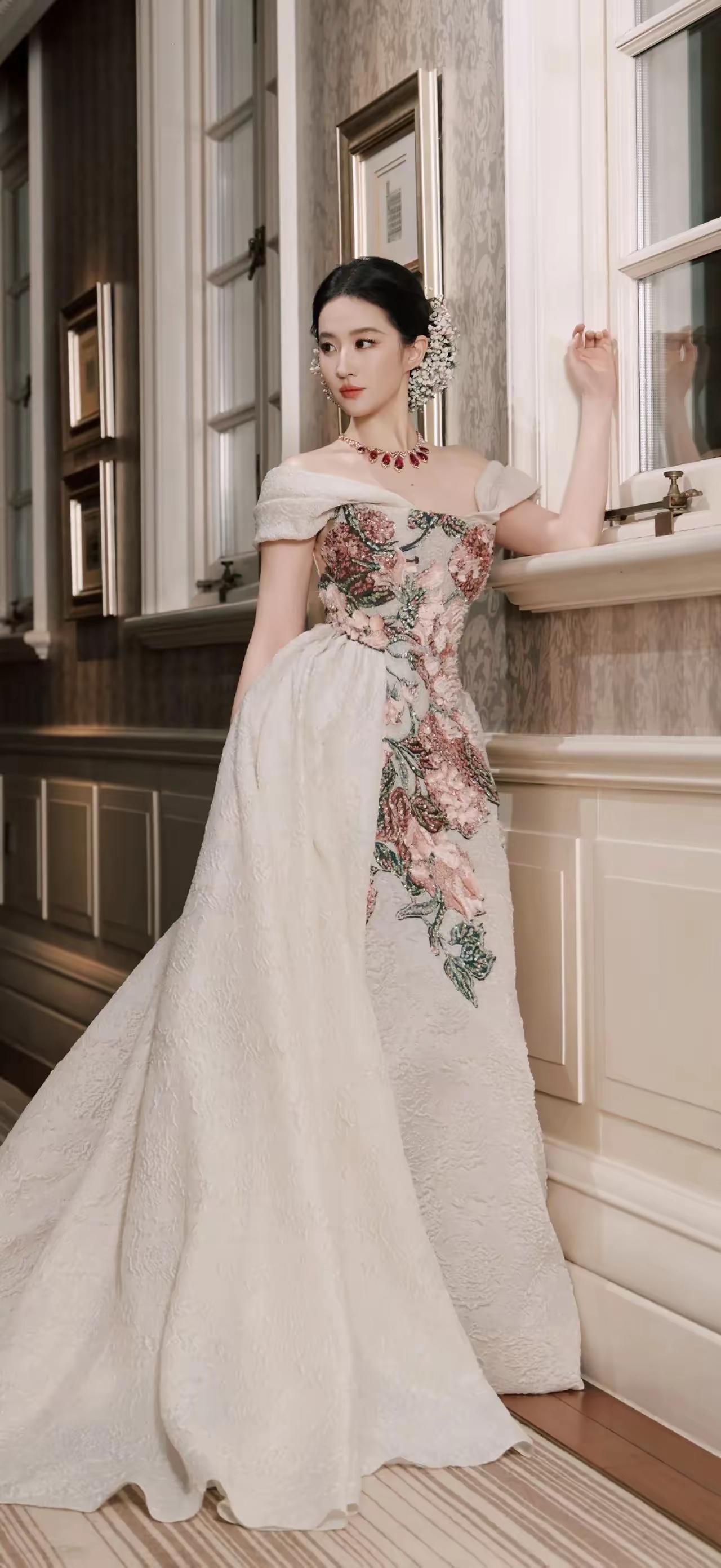 美女壁纸~刘亦菲,白裙繁花刺绣,红宝石点缀,鬓边花饰清雅,温婉矜贵,尽显东方典雅气韵