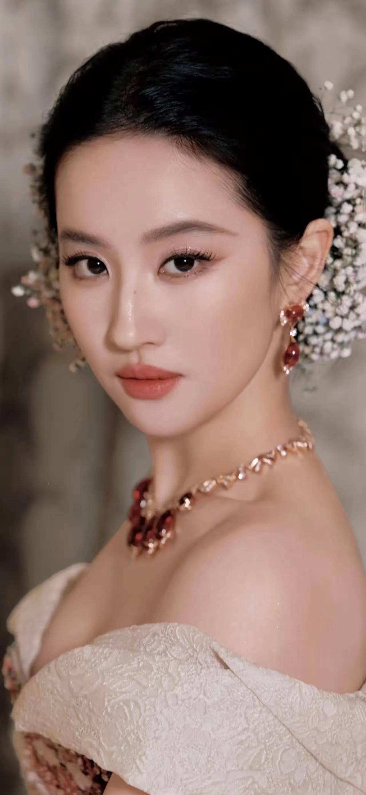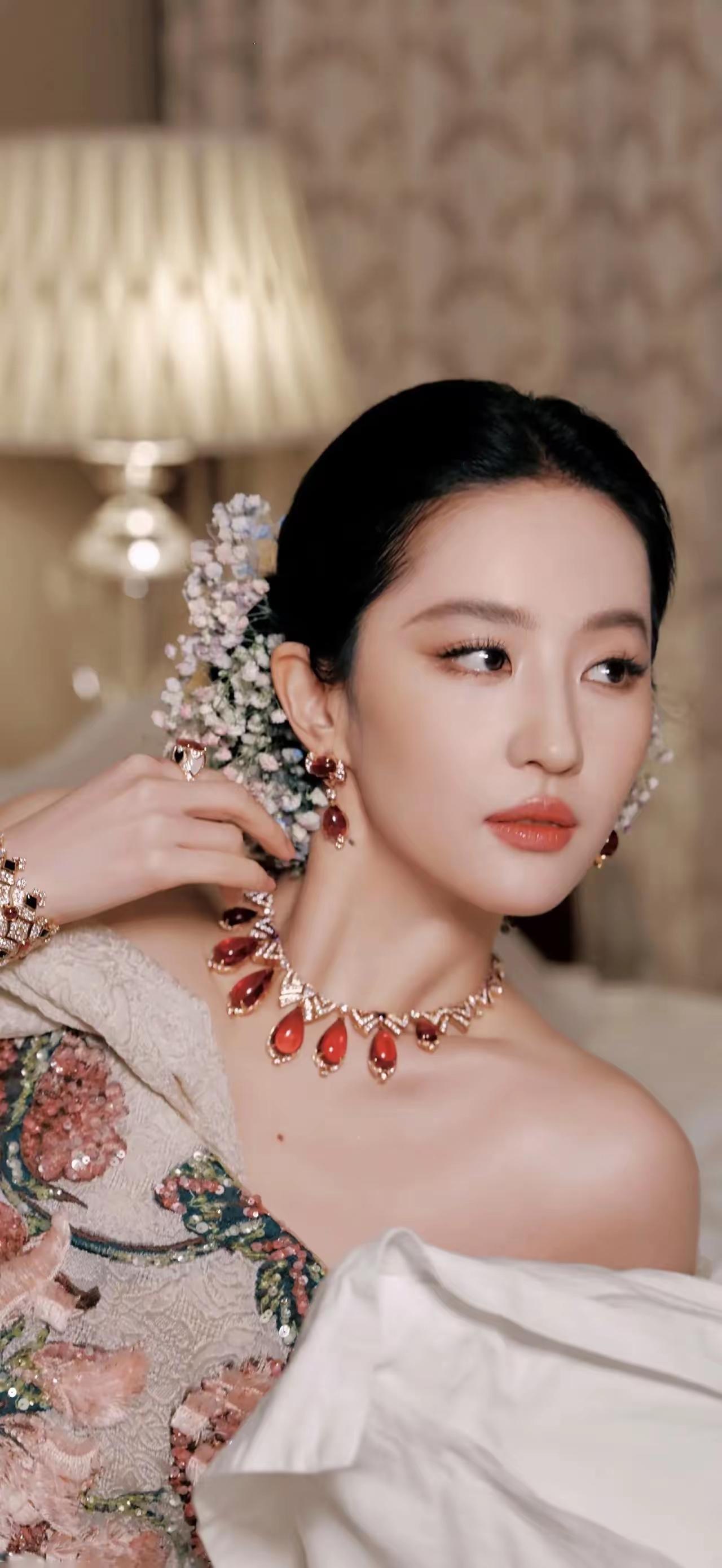 美女壁纸~刘亦菲,白裙繁花刺绣,红宝石点缀,鬓边花饰清雅,温婉矜贵,尽显东方典雅