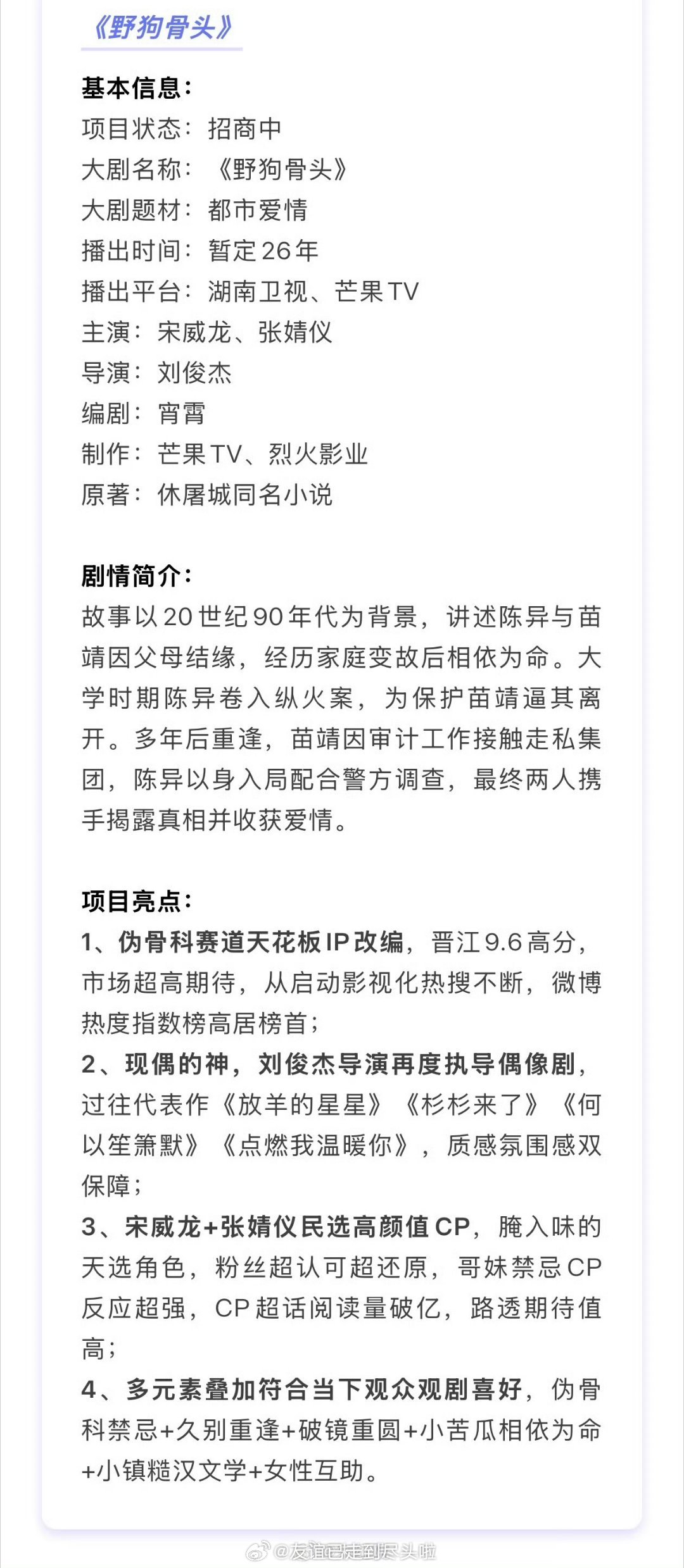 宋威龙、张婧仪《野狗骨头》招商来了,预计7月下旬🥭上线,有人期待这一部吗?