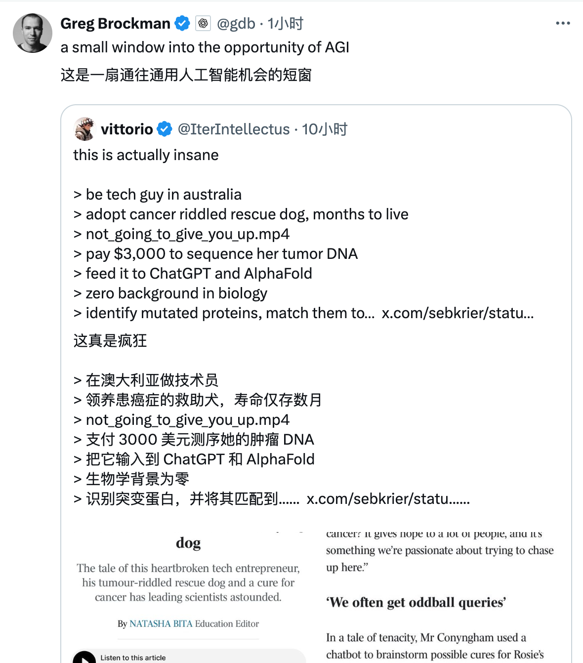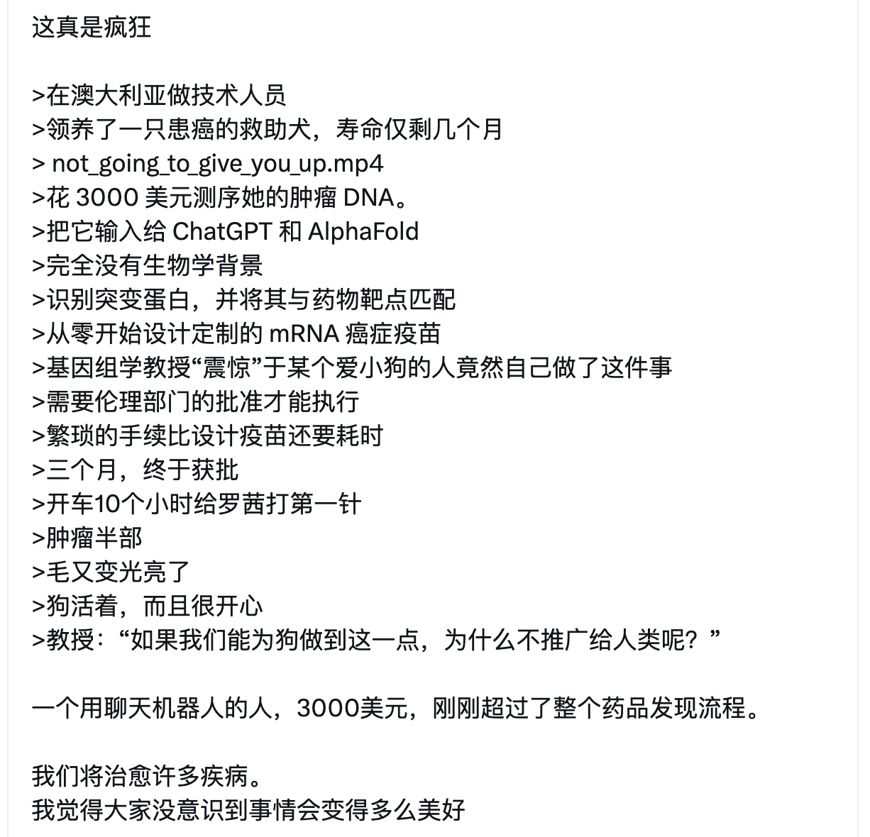 >在澳大利亚做技术人员>领养了一只患癌的救助犬,寿命仅剩几个月> not_going_to_give_you_up.mp4>花 3000 美元测序她的肿瘤 DNA。>把它输入给 ChatGPT 和 AlphaFold>完全没有生物学背景>识别突变蛋白,并将其与药物靶点匹配>从零开始设计定制的 mRNA 癌症疫苗>基因组学教授“震惊”于某个爱小狗的人竟然自己做了这件事>需要伦理部门的批准才能执行>繁琐的手续比设计疫苗还要耗时>三个月,终于获批>开车10个小时给罗茜打第一针>肿瘤半部>毛又变光亮了>狗活着,而且很开心>教授:“如果我们能为狗做到这一点,为什么不推广给人类呢?”