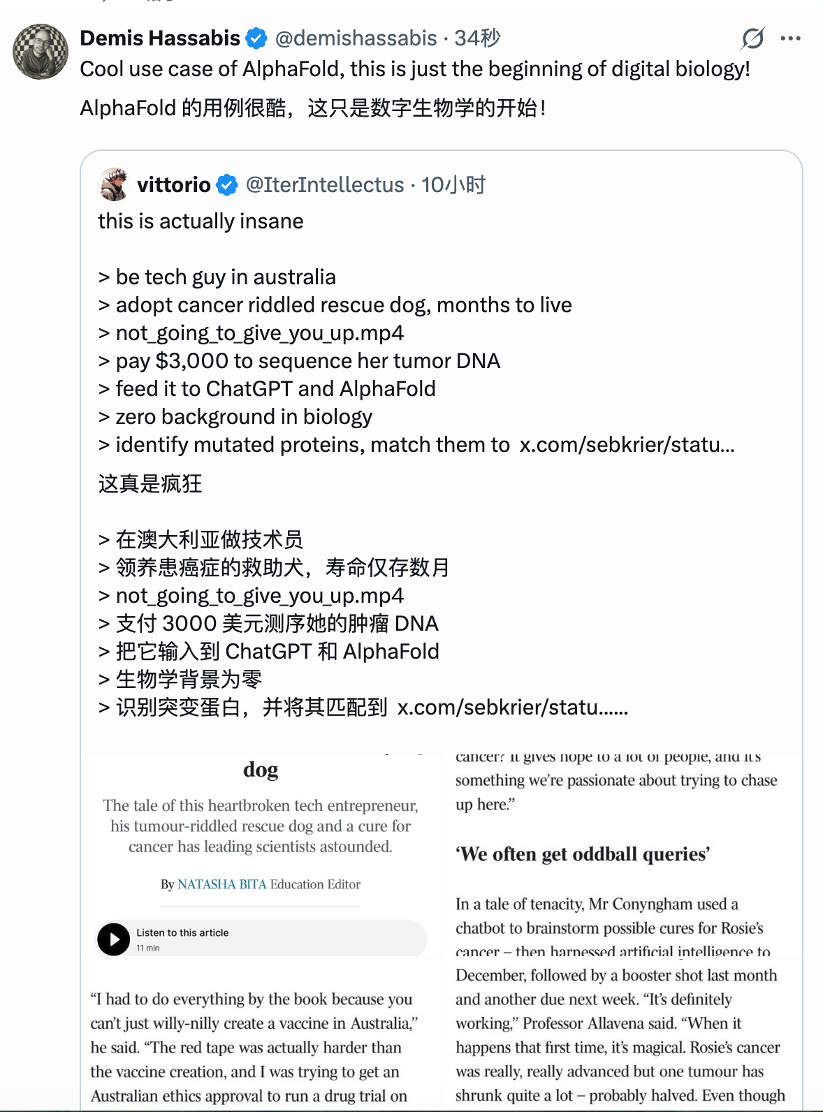 根据《澳大利亚人报》的报道,一名零生物学背景的澳洲科技人,用ChatGPT+AlphaFold+3000美元,为自己的患癌爱犬设计出全球首款个性化mRNA癌症疫苗,肿瘤缩小一半。引来 Demis Hassabis、Greg Brockman 的转发。