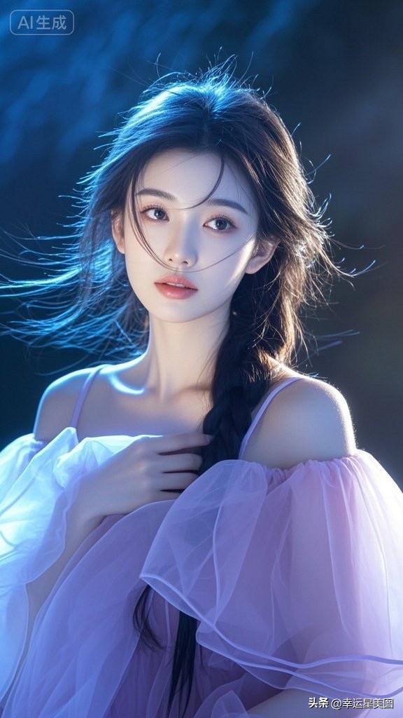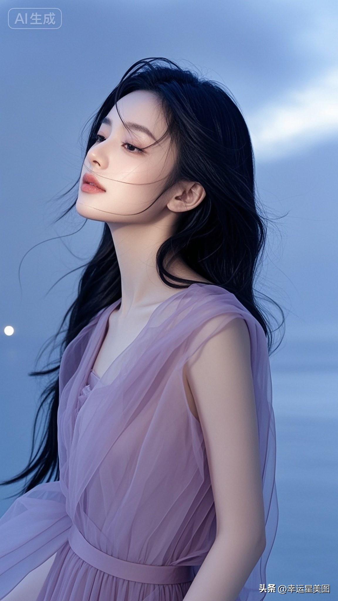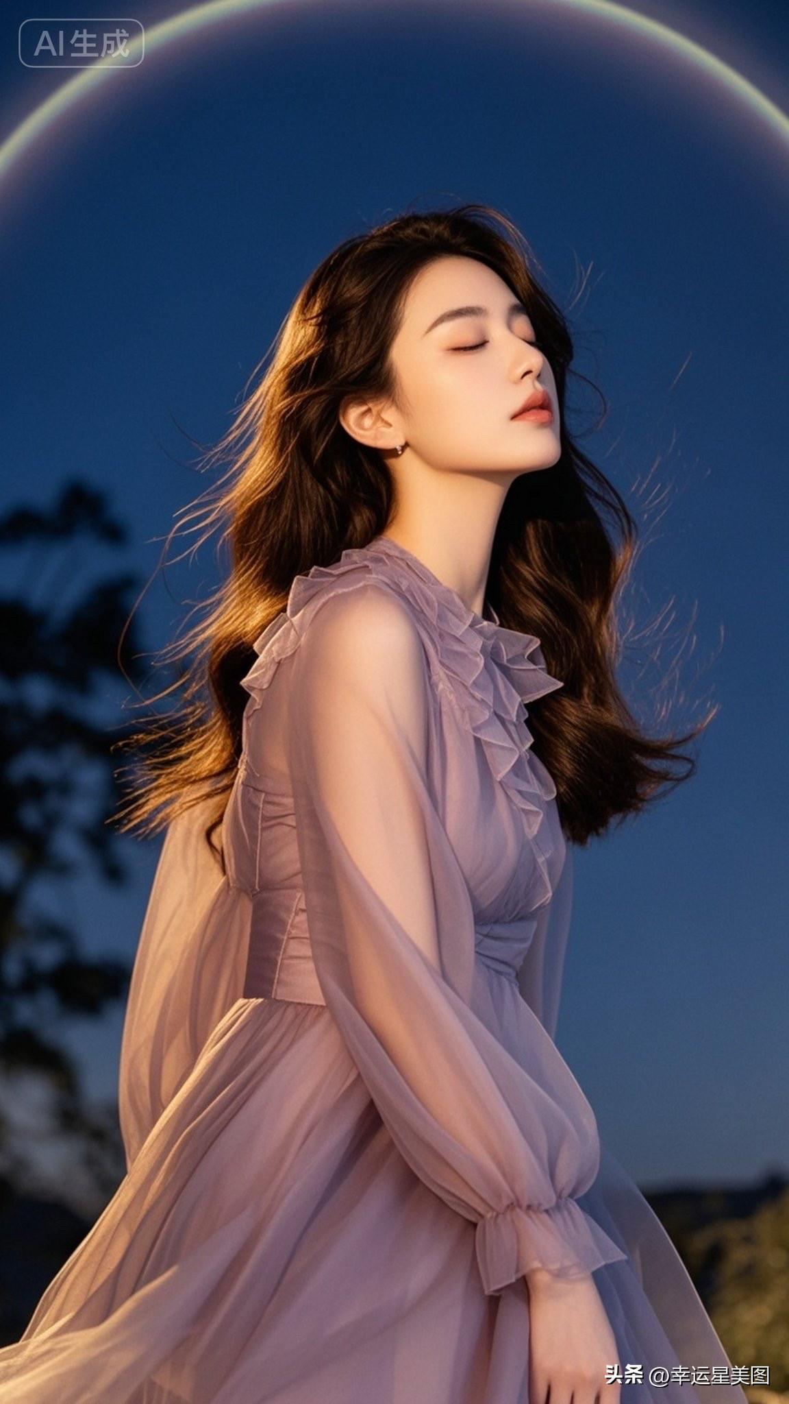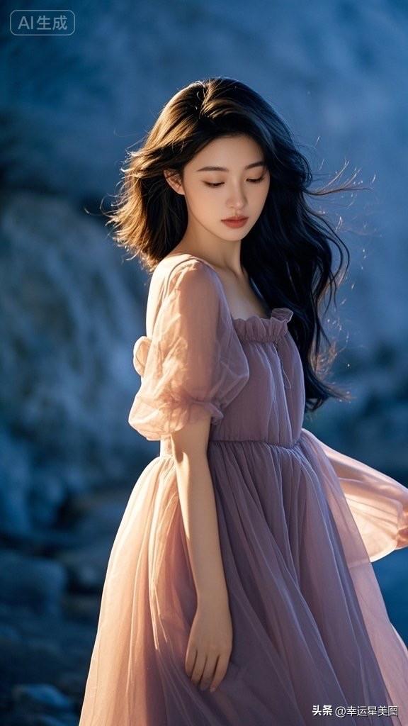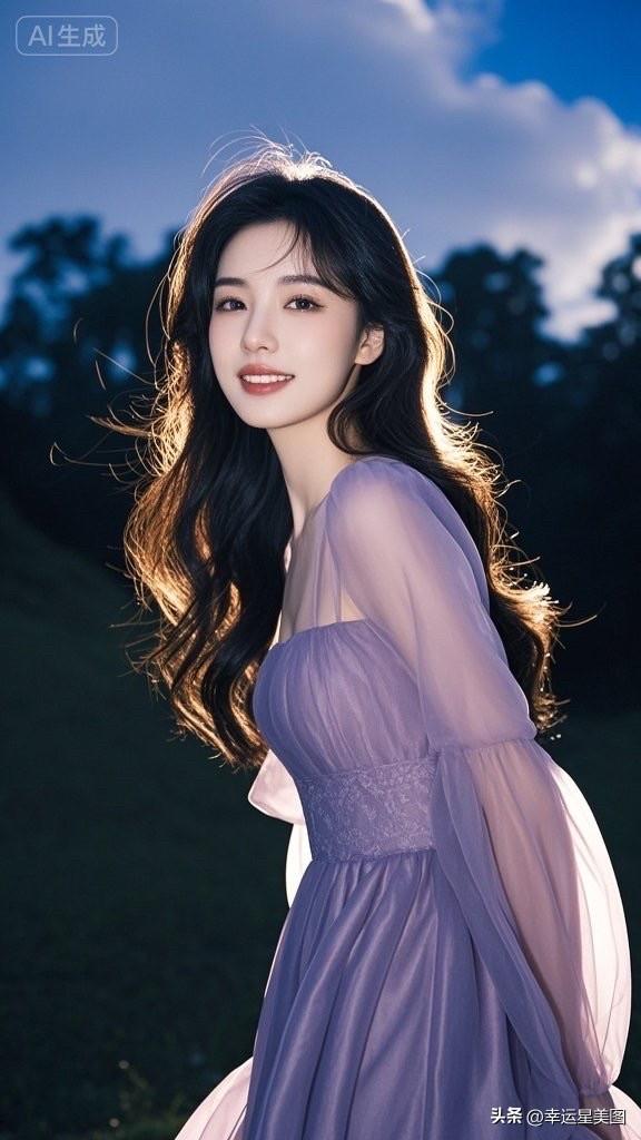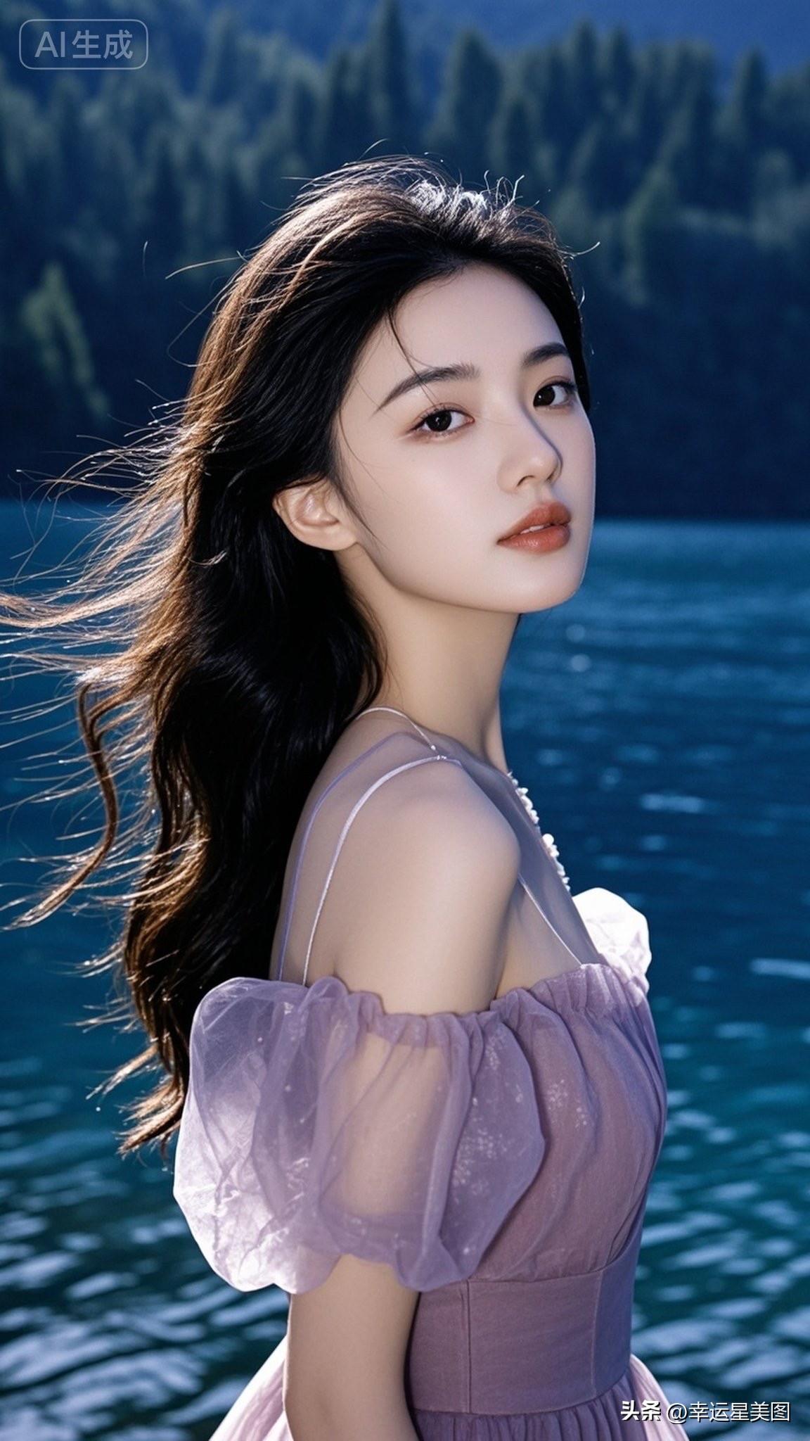 梦幻湖畔少女,紫色裙摆飘逸,自然光下唯美动人。