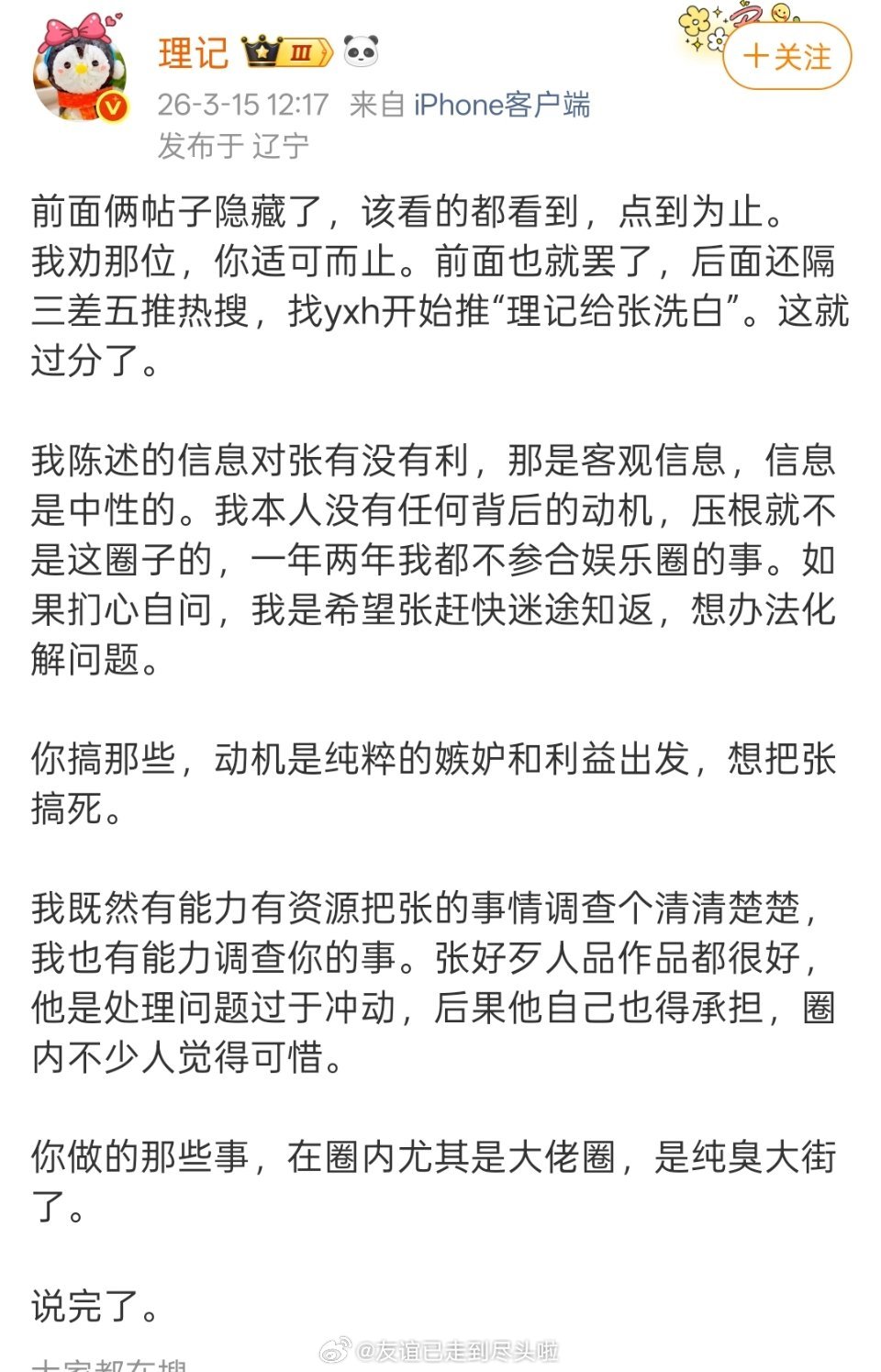 理记现在出来说之前自己爆料张艺兴被国家话剧院处罚这件事是有人故意爆料泄露出来的,而且是同期有竞争的人,为了压自己的负面新闻,就是他把这个事情爆料给理记,不然理记一个圈外人也没渠道知道这事这个理记现在这么说到底是被公关成功还是真的被人当枪使,你怎么看?