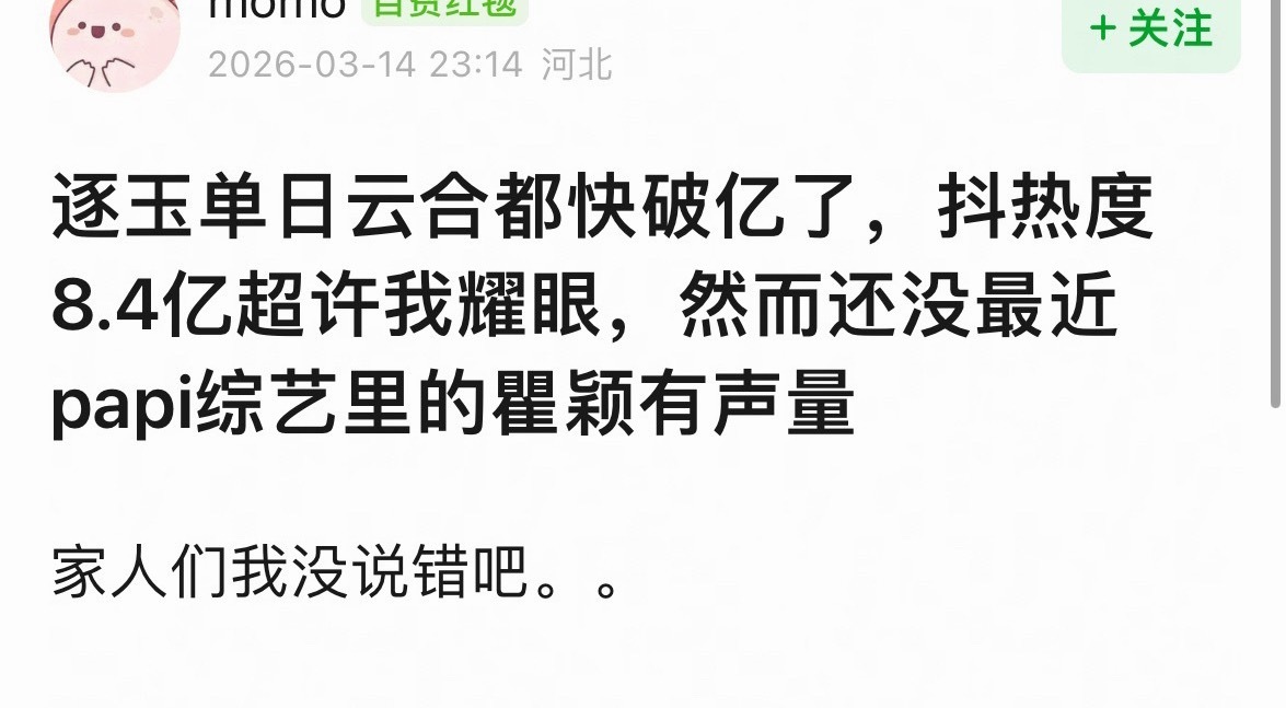 逐玉云合都快破亿了吗,感觉确实没有papi综艺里瞿颖有声量,瞿颖那期梗多得数不过