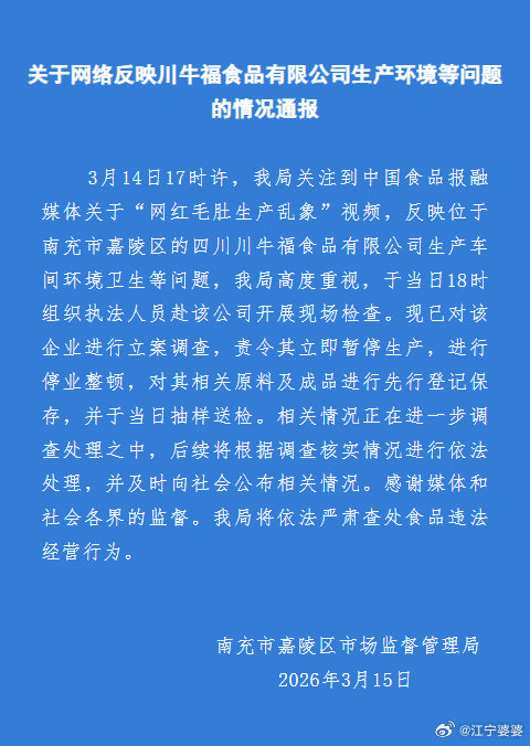3月14日17时许,我局关注到中国食品报融媒体关于"网红毛肚生产乱象"视频,反映位于南充市嘉陵区的四川川牛福食品有限公司生产车间环境卫生等问题,我局高度重视,于当日18时组织执法人员赴该公司开展现场检查。现已对该企业进行立案调查,责令其立即暂停生产,进行停业整顿,对其相关原料及成品进行先行登记保存,并于当日抽样送检。相关情况正在进一步调查处理之中,后续将根据调查核实情况进行依法处理,并及时向社会公布相关情况。感谢媒体和社会各界的监督。我局将依法严肃查处食品违法经营行为。