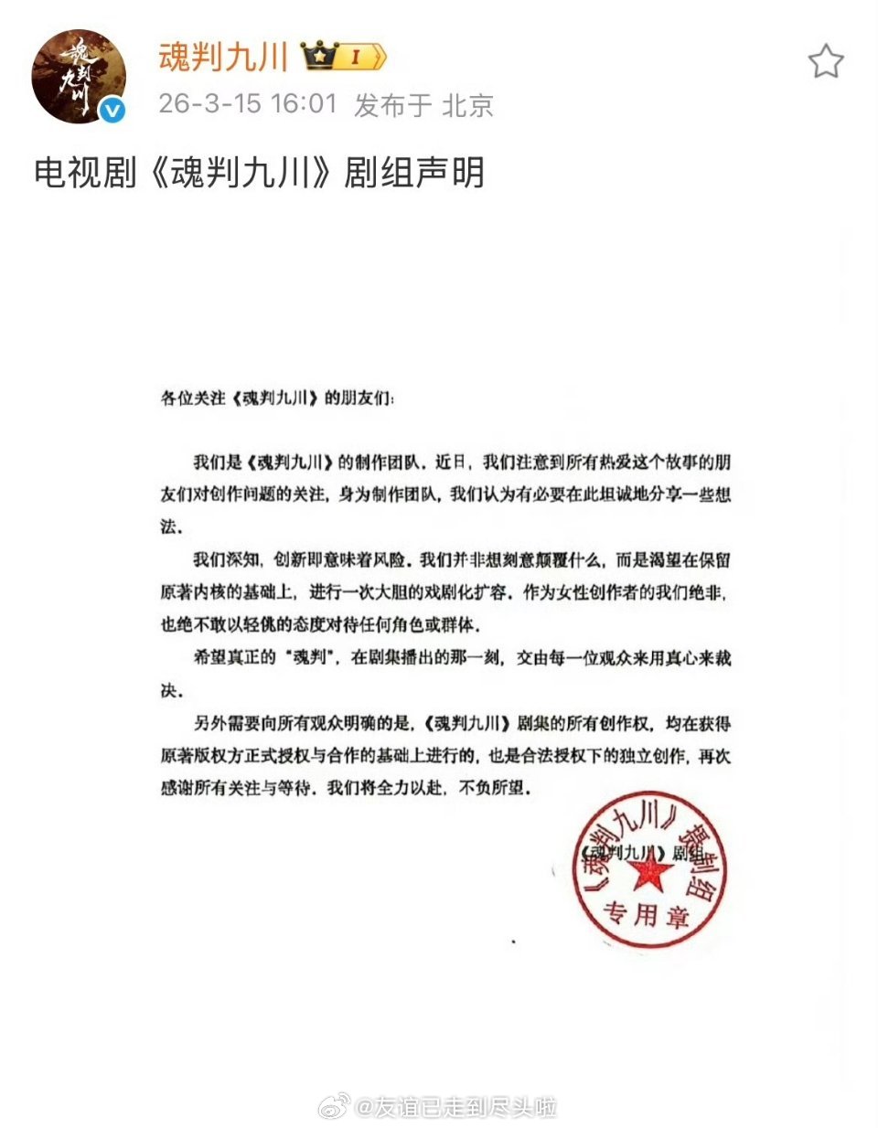田嘉瑞《魂判九川》回应原著大女主小说性转大男主影视剧“我们并非想刻意颠覆什么,而是渴望在保留原著内核的基础上,进行一次大胆的戏剧化扩容,作为女性创作者的我们绝非,也绝不敢以轻佻的态度对待任何角色或群体”