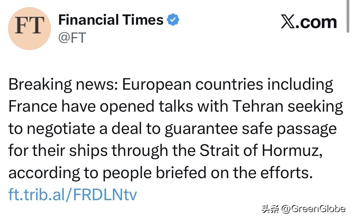 《金融时报》报道突发新闻: 据知情人士透露,包括法国和意大利在内的多个欧洲国家已与德黑兰展开谈判。试图通过谈判达成一项协议,以保证其这些国家的船只安全通过霍尔木兹海峡。 背景资料:伊朗自美以轰炸之后,就宣布关闭霍尔木兹海峡,造成大量货船积压无法通过。进而会产生更多的货物供给的问题,同时对油价也是很大的压力。
