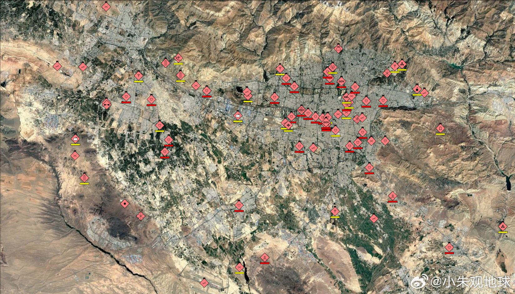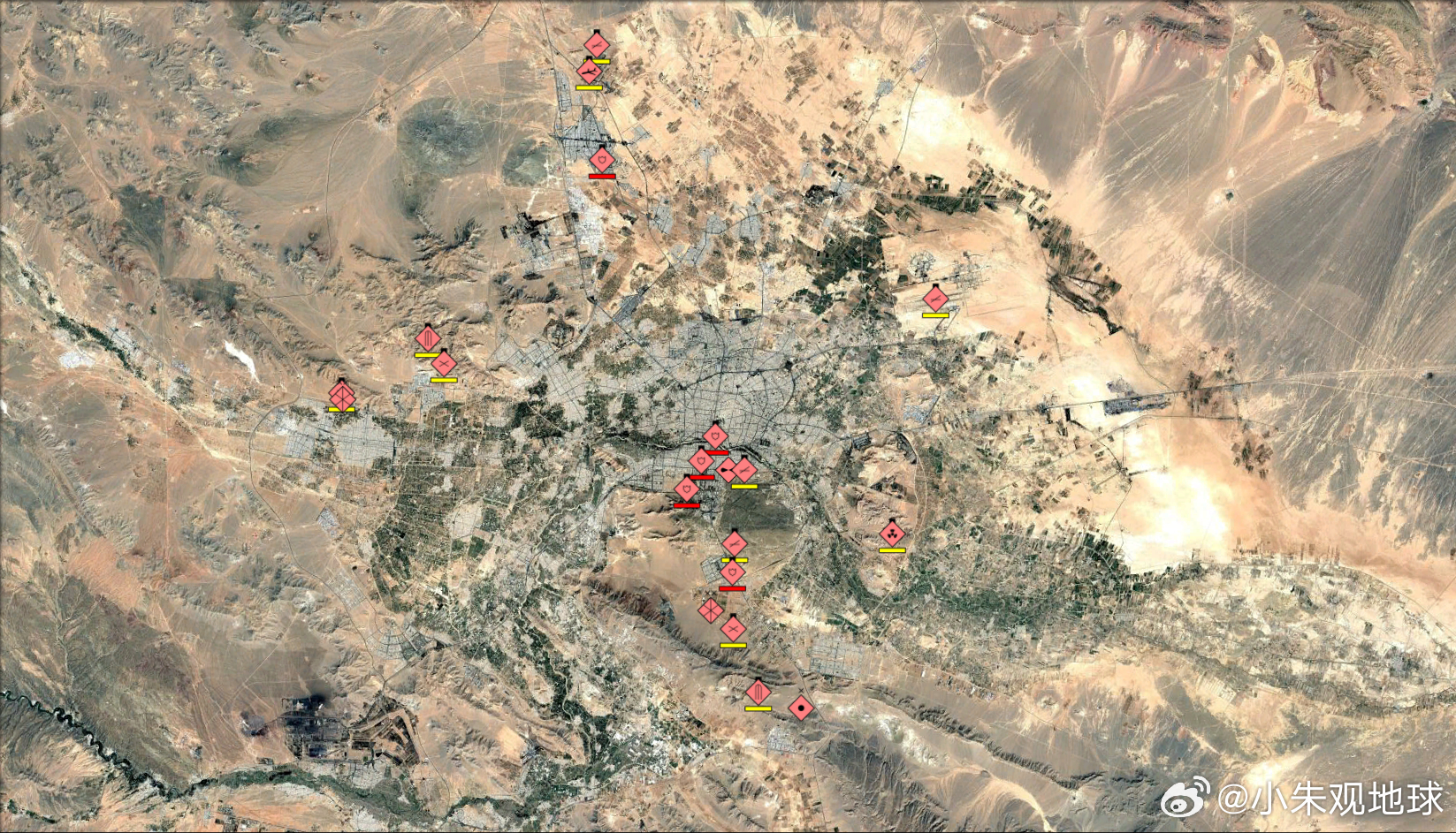 图中所示为伊朗军事基地的受损评估,下黄线为受损设施,下红线的设施已完全损毁 美伊