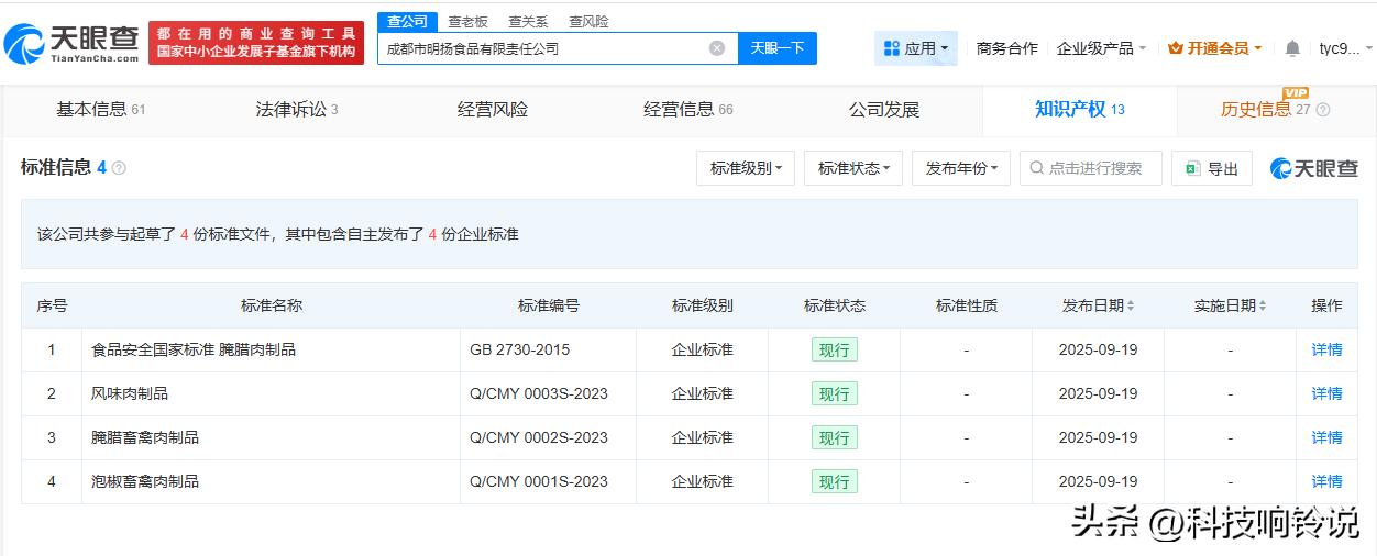 【天眼查数据:315曝光漂白鸡爪公司曾参与起草企业标准 明扬食品曾参与起草泡椒畜禽肉制品企业标准】 央视315晚会曝光漂白鸡爪的问题,成都市明扬食品有限责任公司被点名。 天眼查App显示,成都市明扬食品有限责任公司成立于2007年3月,法定代表人为姚作平,注册资本200万人民币,经营范围包括禽类宰杀、肉类食品冷冻、销售等,由姚作平、杨宗惠共同持股。知识产权信息显示,该公司曾参与起草“泡椒畜禽肉制品”“腌腊畜禽肉制品”等企业标准信息,标准状态为现行。 天眼查信息: