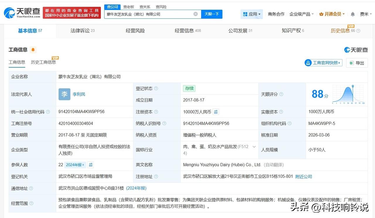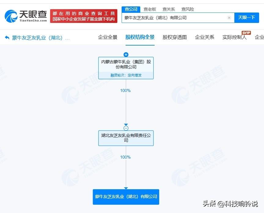 【蒙牛友芝友乳业近期变更高管 起底饮品包装成牛奶涉事公司】 据媒体报道,近期,饮品包装成牛奶的问题被曝光,蒙牛友芝友乳业(湖北)有限公司被点名。 天眼查App显示,涉事公司蒙牛友芝友乳业(湖北)有限公司成立于2017年8月,注册资本1亿人民币,经营范围包括预包装食品兼散装食品、乳制品批发兼零售,厂房租赁,企业管理咨询服务等。股权全景穿透图显示,该公司由蒙牛旗下湖北友芝友乳业有限责任公司全资持股。变更记录显示,近期,王亚辉卸任法定代表人、经理,由李利民接任。 天眼查信息: