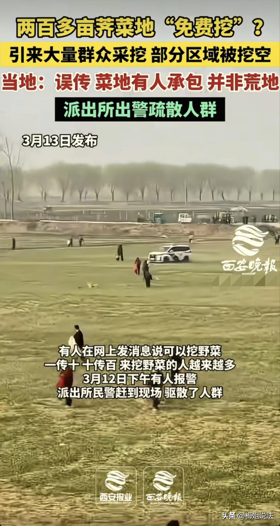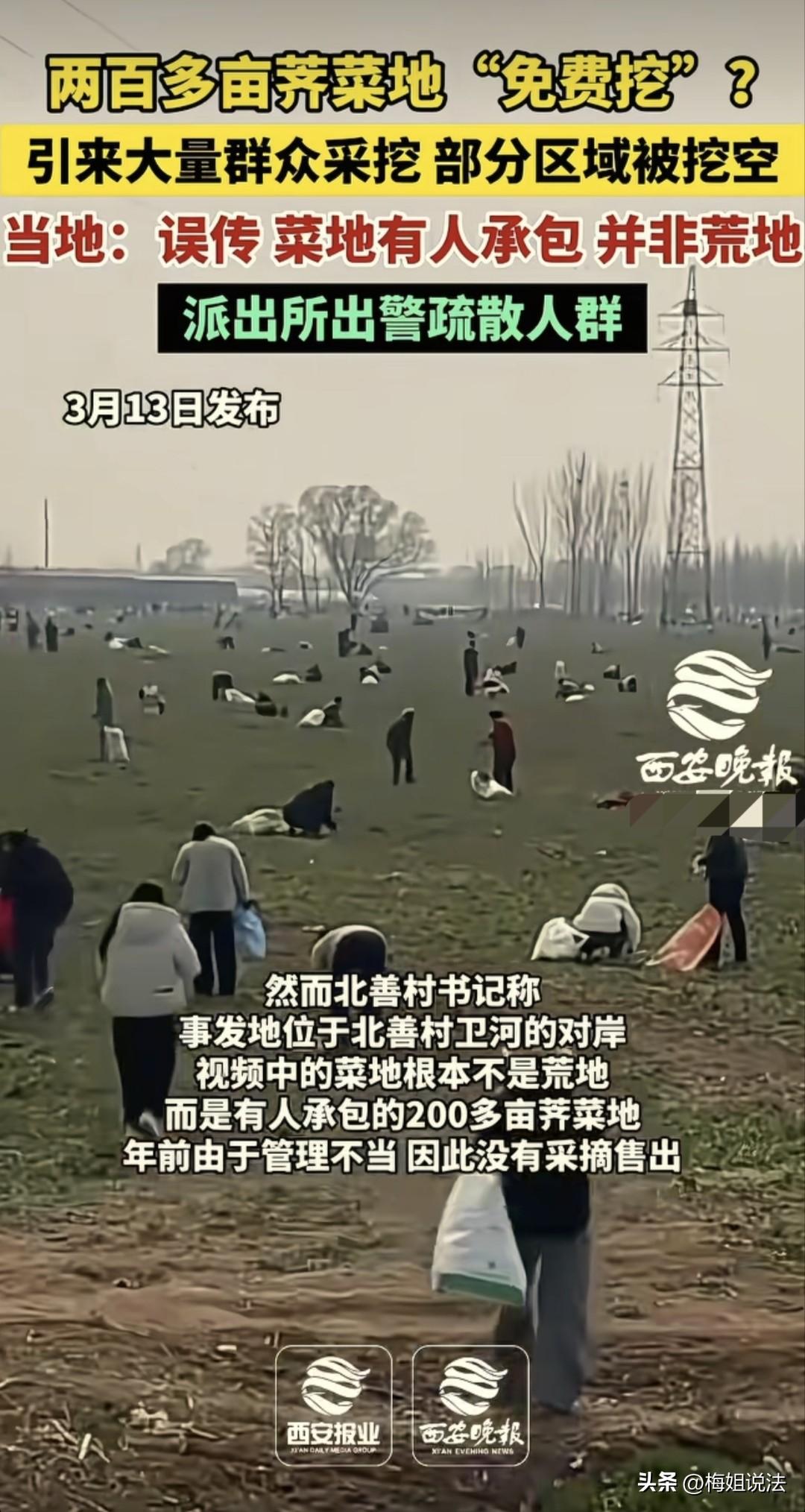 河南,菜农辛辛苦苦种植了200多亩的荠菜,自己还没来得及采摘,一个女子就传谣言,说“人家不要了,随便薅”!数百名群众闻言前来采挖,乡间小道停满了外来的车辆。菜主已无力阻拦,叫苦不迭:这是我的菜!不能挖啊! 3月12日,一女子在网上喊话,称河北与河南交界的卫河边有一大片荠菜地,地主不要了,地里的菜可以随便薅!并在视频里贴心地附上了地址,叫大家快点来摘。 当天,该视频被广泛传播,一传十,十传百招来了大批的网友前来挖野菜,村路上的车子停了长长的一条,两个轮、三个轮、四个轮的都有,带袋的、带桶的、带锄头的、带铲的,各种工具五花八门。 200多亩的菜地不到一天就汇集了数百人,有人甚至为了采荠菜,专门从几十公里外开车过来。 路过的村民看到大片的人群,以为是菜地的主人终于找人收摘来了,但仔细一看,怎么还有车子直接开到菜地里去了,还不止一辆,手上拿着的工具也是五花八门,心想:坏了,这怕不是有人来偷菜了!于是赶紧去通知人。 等到菜地的主人赶到现场,看着这乌泱泱的人群,大家一个接一个提着一袋袋、一桶桶荠菜,有说有笑往自己车的方向走,他只能无奈报警。 此时已是当天下午,民警抵达现场时,仍是人山人海,大家热情高涨地你一铲我一锄挖着荠菜。 好不容易把人群全部驱离后,菜地的主 人和民警一起查看损失情况,发现有不少区域都被挖空了,土层也被翻的乱七八糟,有些人不会挖,挖坏的荠菜丢在一边,还有被踩坏的,半数的心血毁于一旦! 菜地主人解释,这些荠菜是他年前种下的,因为去年被别的事情耽搁了,就一直没收这些菜,本想忙完这阵就把菜给收了,哪能想发生这种事,一两个人来也就算了,也吃不了多少,可偏偏几百个人连挖带提,装车带走,他根本阻止不了。 根据民警调查显示,一开始,有不少网友定位错误,来到河的对岸,河北的地界去了,但当地人发现他们要到对岸去挖野菜,就告诉他们这是人家承包的,不能挖。 并且河北当地已经通知下去,要告诉大家不能去挖对面的野菜。 但仍有一部分人,想着来都来了,总不能空手走,再说了别人能挖,怎么自己刚到就不能挖了? 更过分的是,有的人不仅挖了满满一后备箱的荠菜,还要拍到网上炫耀,也附上一句:荠菜免费挖! 于是就有了大家争相效仿:我不仅要挖,我还要挖的多!最后他们是满载而归了,菜地主人损失惨重! 根据《治安管理处罚法》,数百人私挖他人菜地作物,属于哄抢私人财物行为,参与者可被处以拘留或罚款,情节严重者还需承担刑事责任。 不过当地考虑到参与人数众多,荠菜本身单价不高,目前暂未对挖菜群众追责,但这并不意味着这一行为就是正确的,它依然是不合法的。 像本次事件中,比较核心的因素还是那名率先喊话免费挖野菜的女子,由于她的个人行为导致菜农损失严重,尽管在她喊话之前已有人在这片菜地私挖荠菜,但是如果她没有谎称“该地没人要,野菜免费挖”,没有发布视频,也不会引来大规模的人群。 根据《治安管理处罚法》,私自散布谣言扰乱了公共秩序,可以被处以拘留罚款;且如果该不实信息造成了菜主巨大的经济损失,那女子的行为就涉及到寻衅滋事、故意毁坏财物罪了。 目前,当地相关单位正在对该女子进行调查处理。 春天到了,大家想吃点春菜是人之常情,菜市场、超市肯定是有的卖,就算价格可能会贵点,大不了少买点,何苦大老远跑到别人的地盘去挖别人的菜,也许挖到的菜连油钱都不够。 就算再怎么不明白,当看到这样一大片的、两百多亩的地里长满了错落有序、长势喜人的荠菜,也该想到肯定是有人打理过,不可能是野生的,就算想吃也可以和菜主人商量给便宜买些带走,私挖偷挖的行为一律不可取! 来源:极目新闻 来源:西安晚报